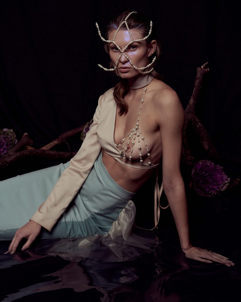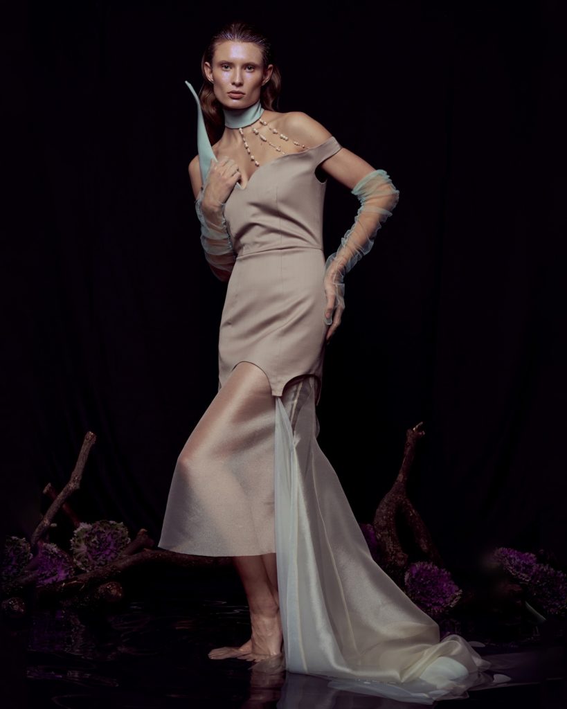 Морська тематика пронизує кожен образ, розкриваючись у відкритих плечах та спинах; у коротких топах та облягаючих штанах; у драпіровках та оборках, що нагадують гребені морських хвиль; у легкості фактур, що відсилають до морської брижі; у колірній гамі – від теплого пісочного до насиченого кольору морської хвилі.