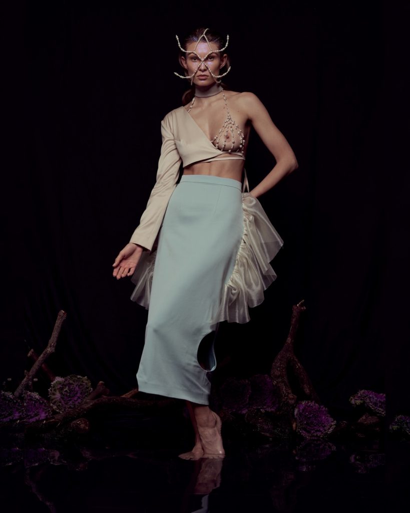 A nautical theme permeates every look, revealing in open shoulders and backs; in short tops and tight-fitting trousers; in draperies and frills, reminiscent of the crests of sea waves; in the lightness of textures, referring to the sea ripples; in colors – from warm sand to deep sea green.