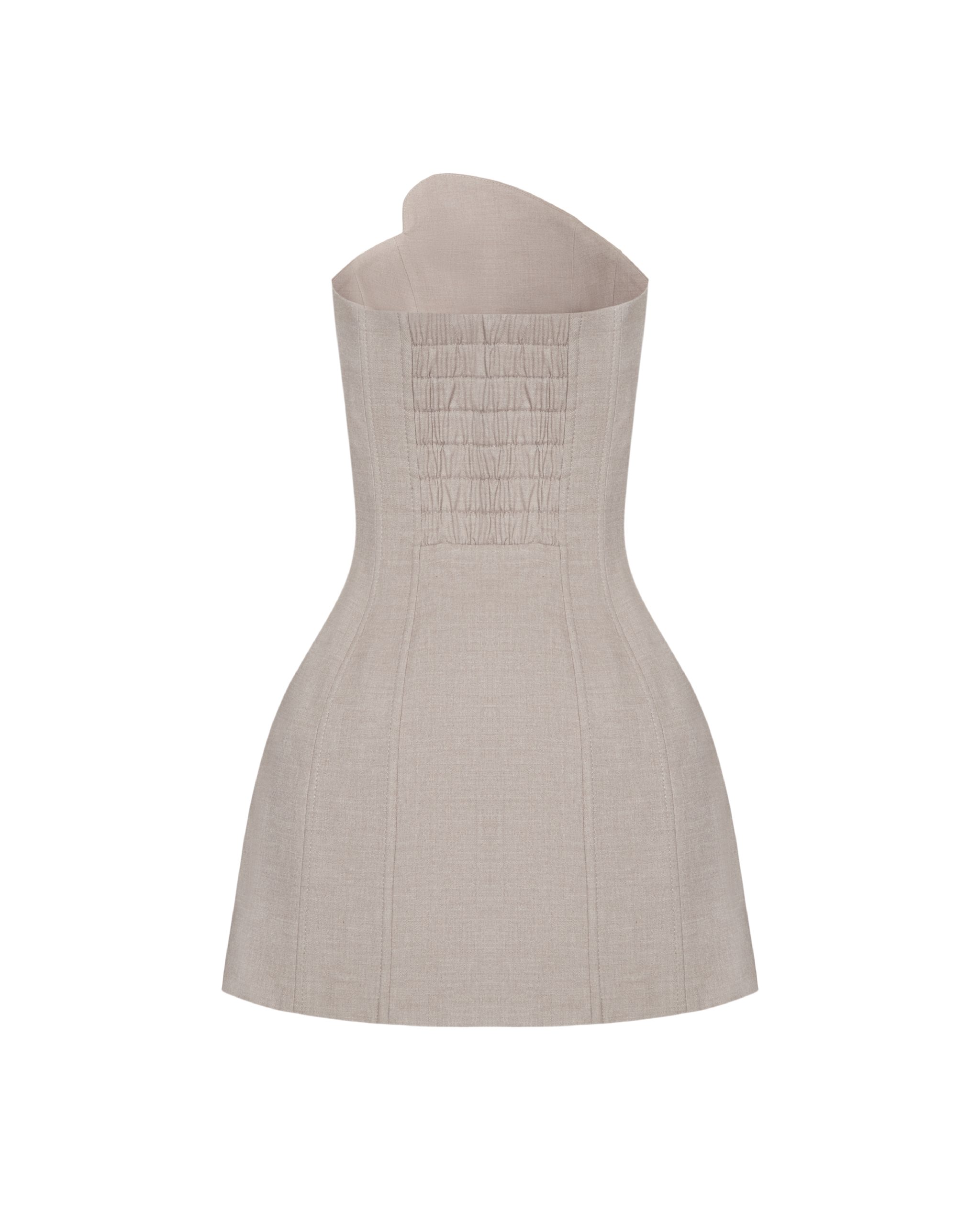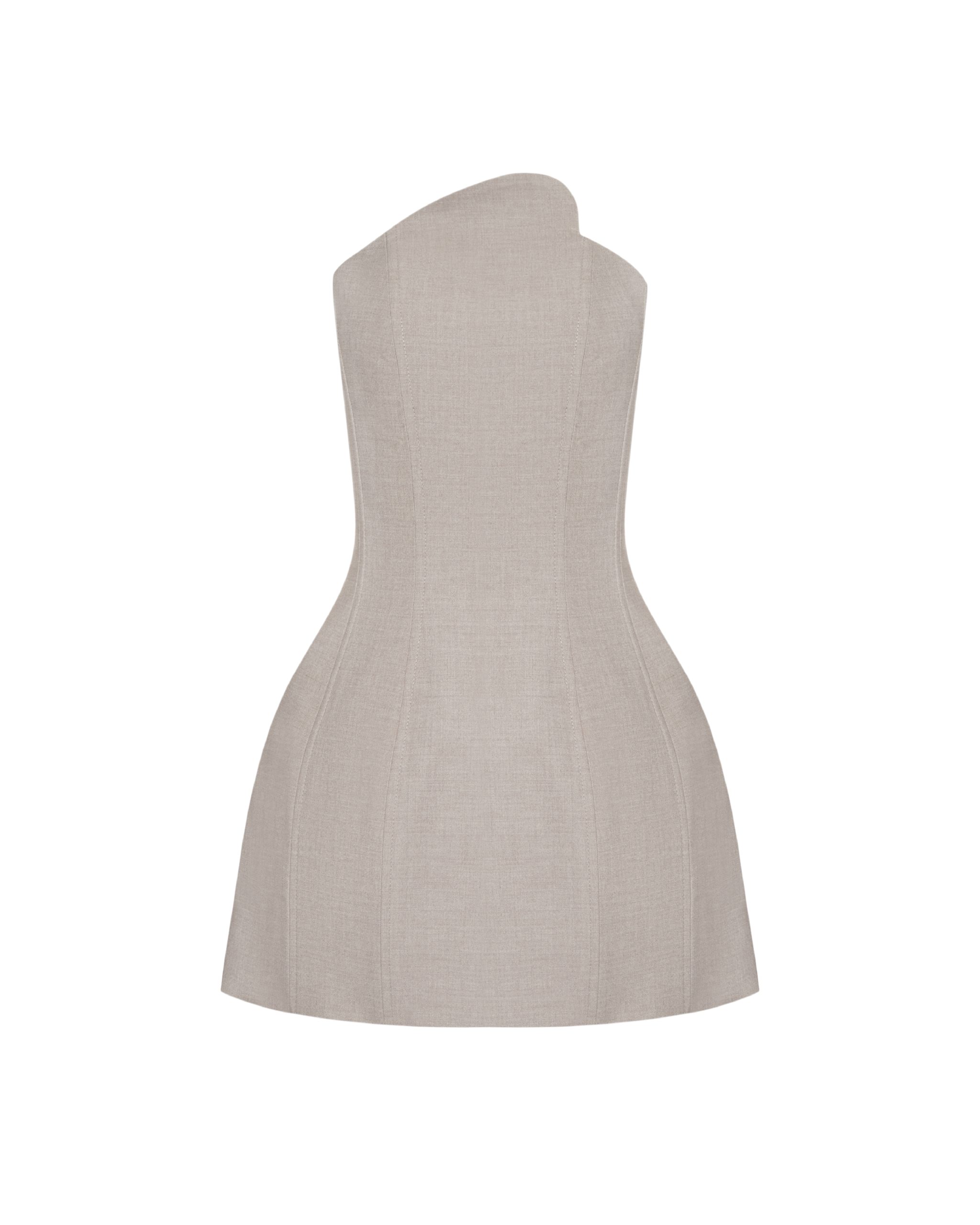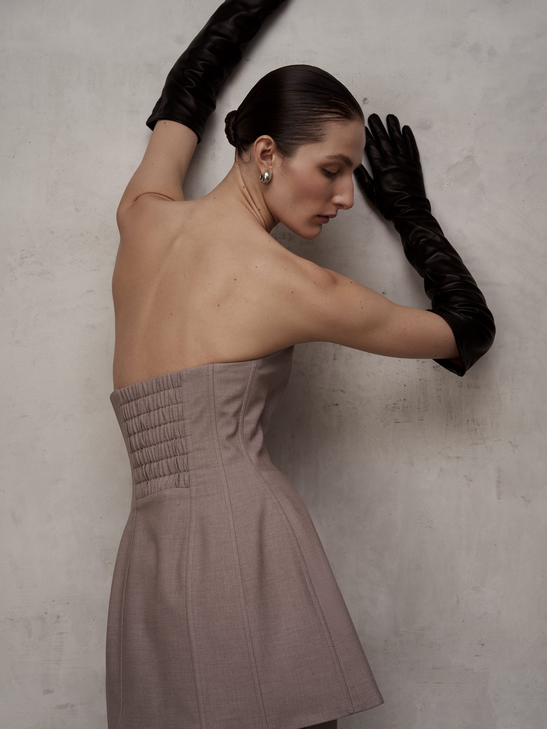 Корсет скульптурного силуету, виготовлений з подвійного шару костюмної тканини з сумішшю вовни. Виріб має асиметричну фігурну лінію на грудях та вшиті кісточки, завдяки чому відмінно тримає форму. Застібається на розʼємну блискавку в боковому шві. Довжина корсету нижче лінії стегон.