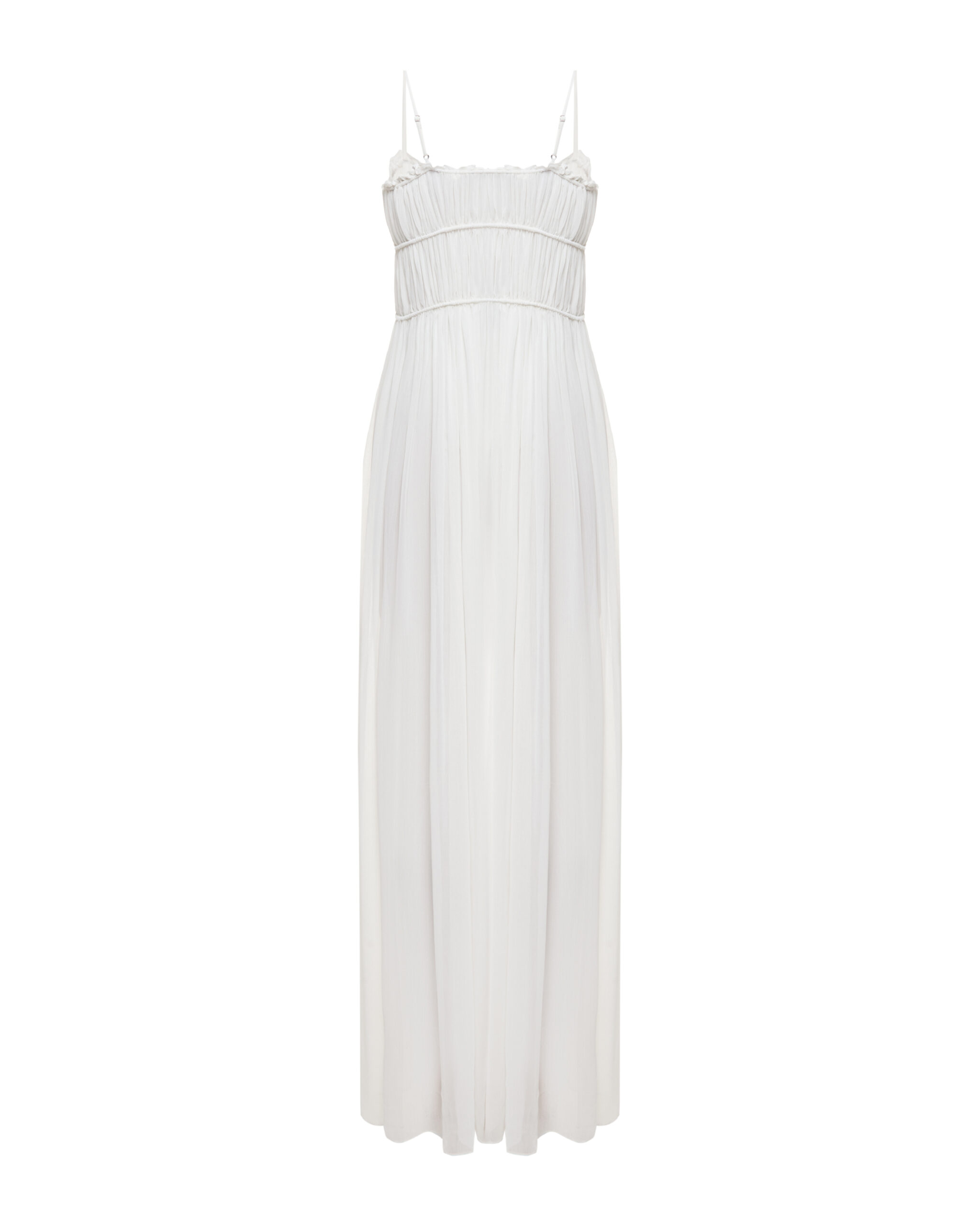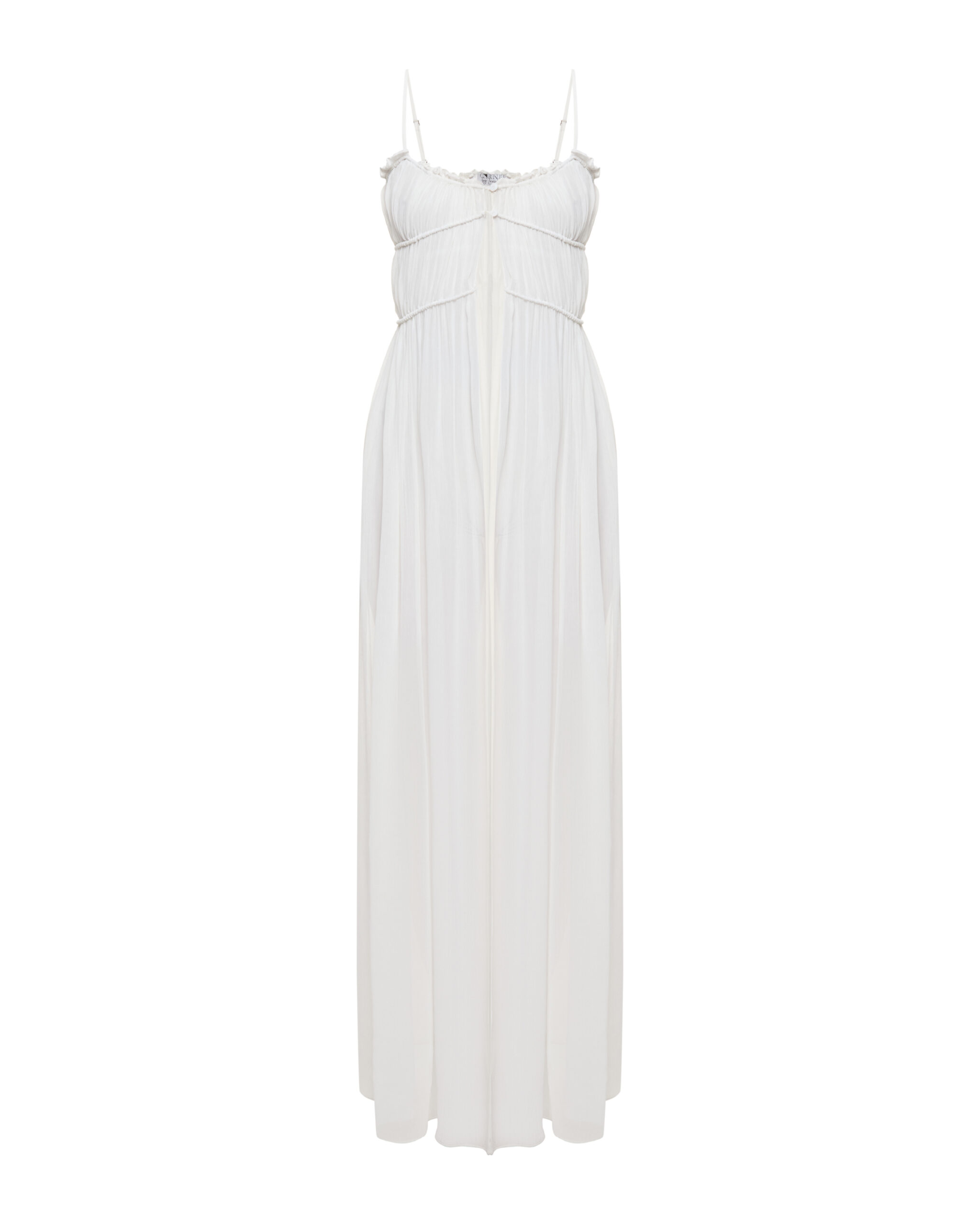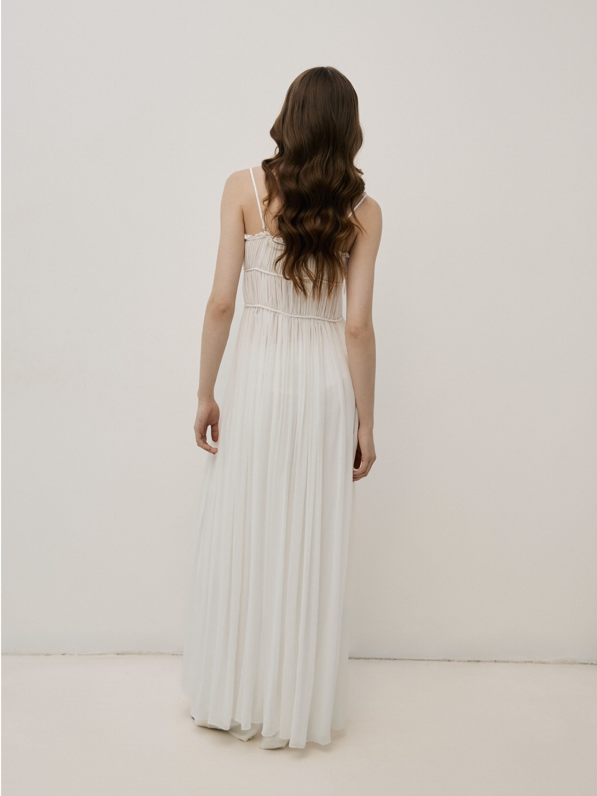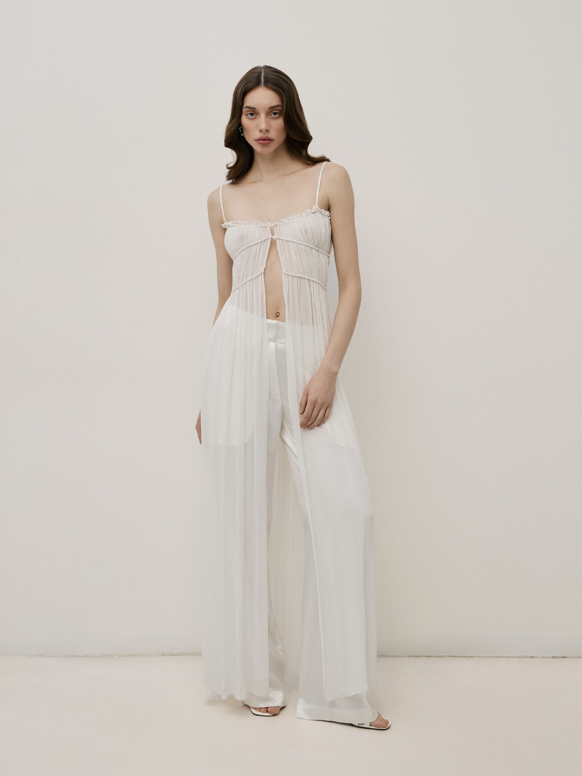 Блуза вільного крою, виготовлена з легкого напівпрозорого шифону. Виріб має делікатні горизонтальні шви на лінії бюсту та талії, які формують м’яке драпірування. Бретелі— тонкі та регульовані. Застібається на ґудзики з натуральної мушлі. Довжина блузи максі.