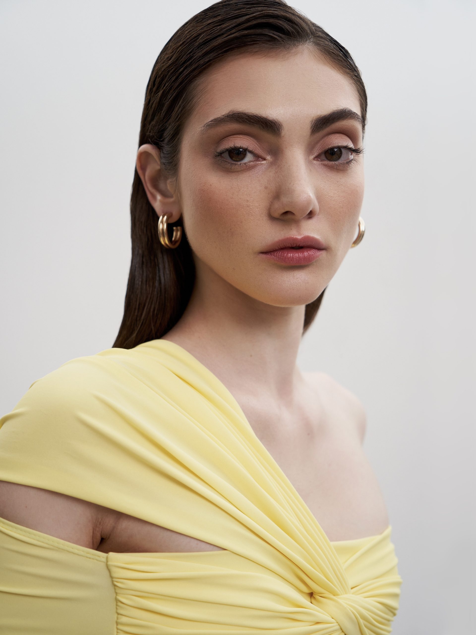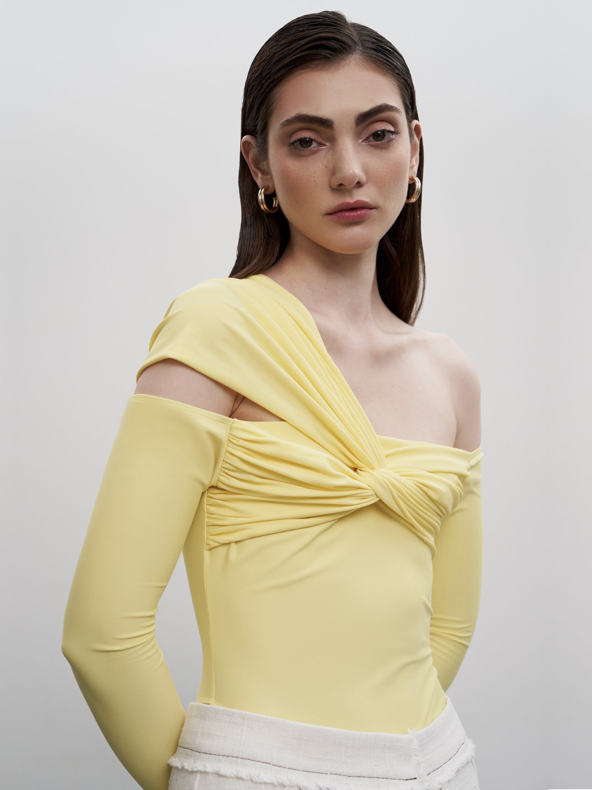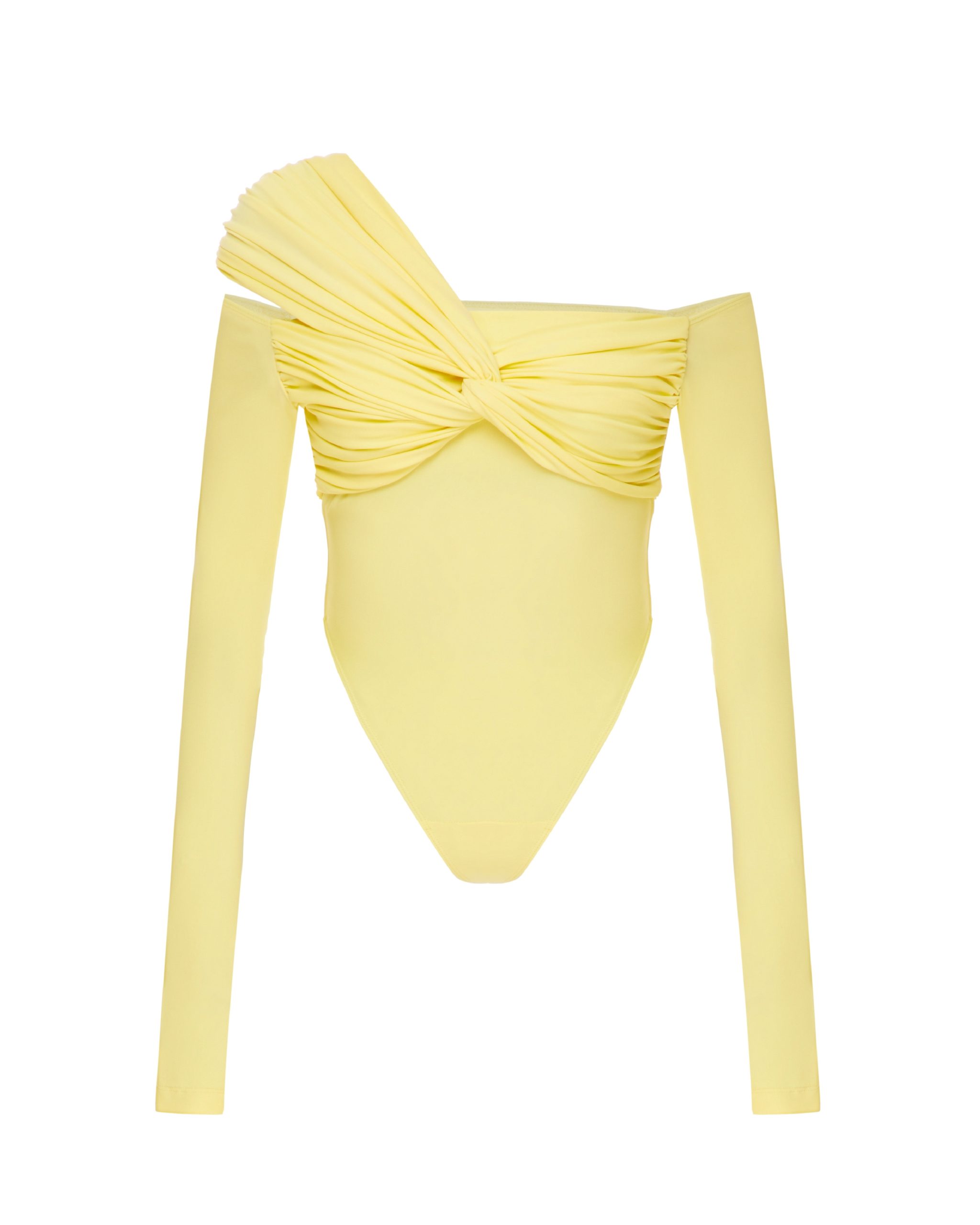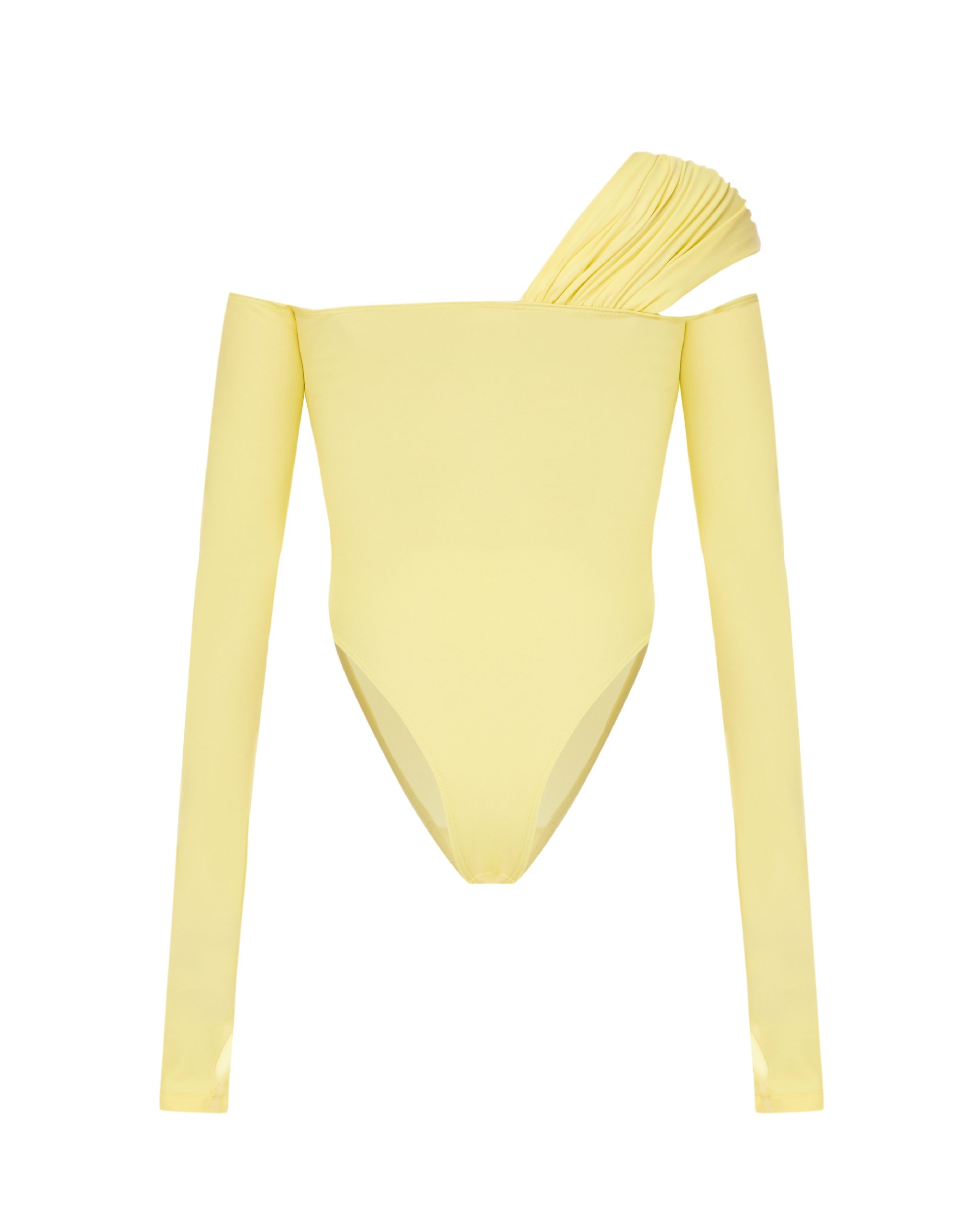 Боді з відкритими плечима, виготовлене з м’якого матового біфлексу. Виріб має асиметричне драпіювання на грудях. Рукав подовжений з отвором для пальця в нижній частині рукава. Застібається на пришивну тасьму з гачками.