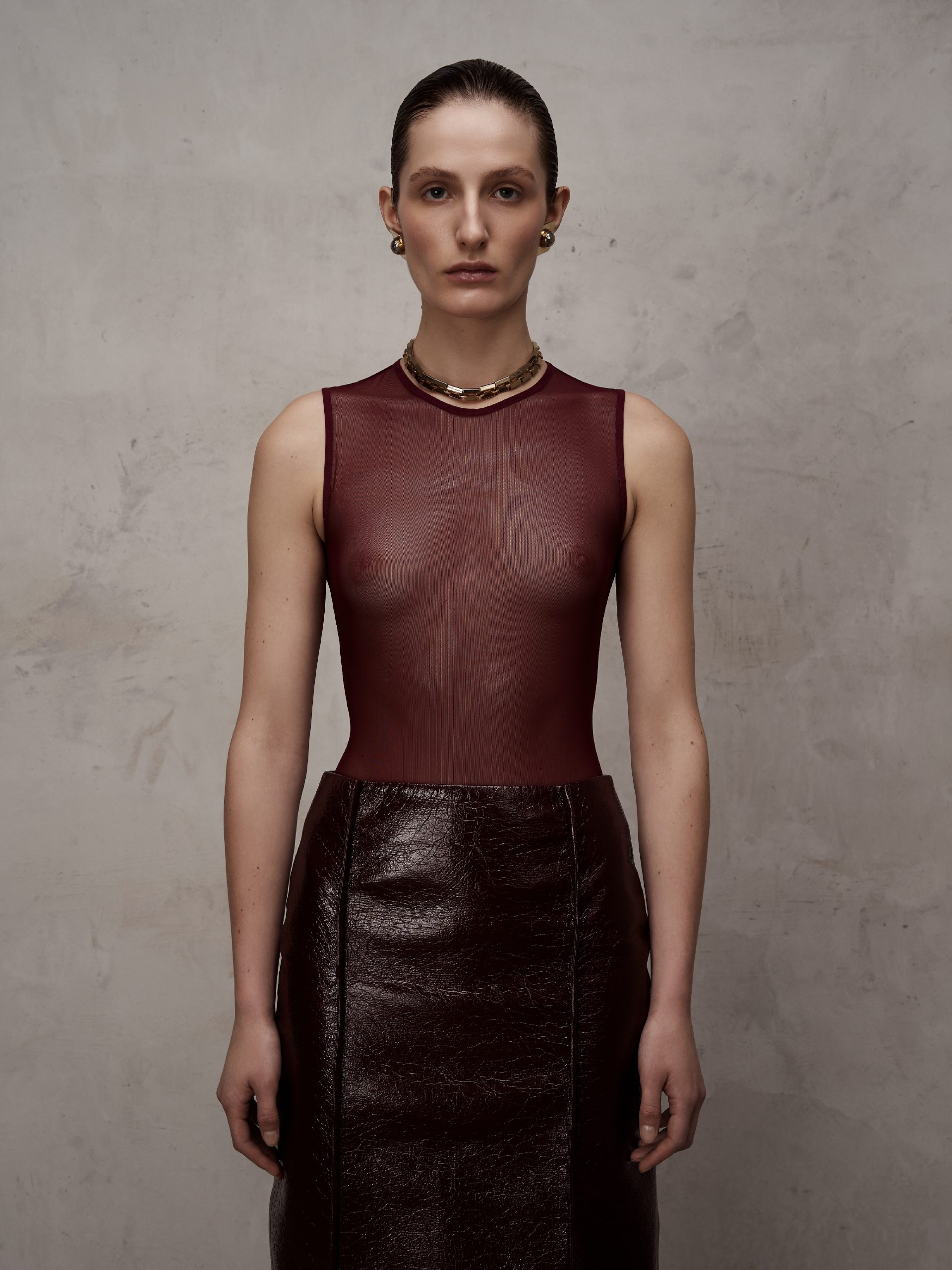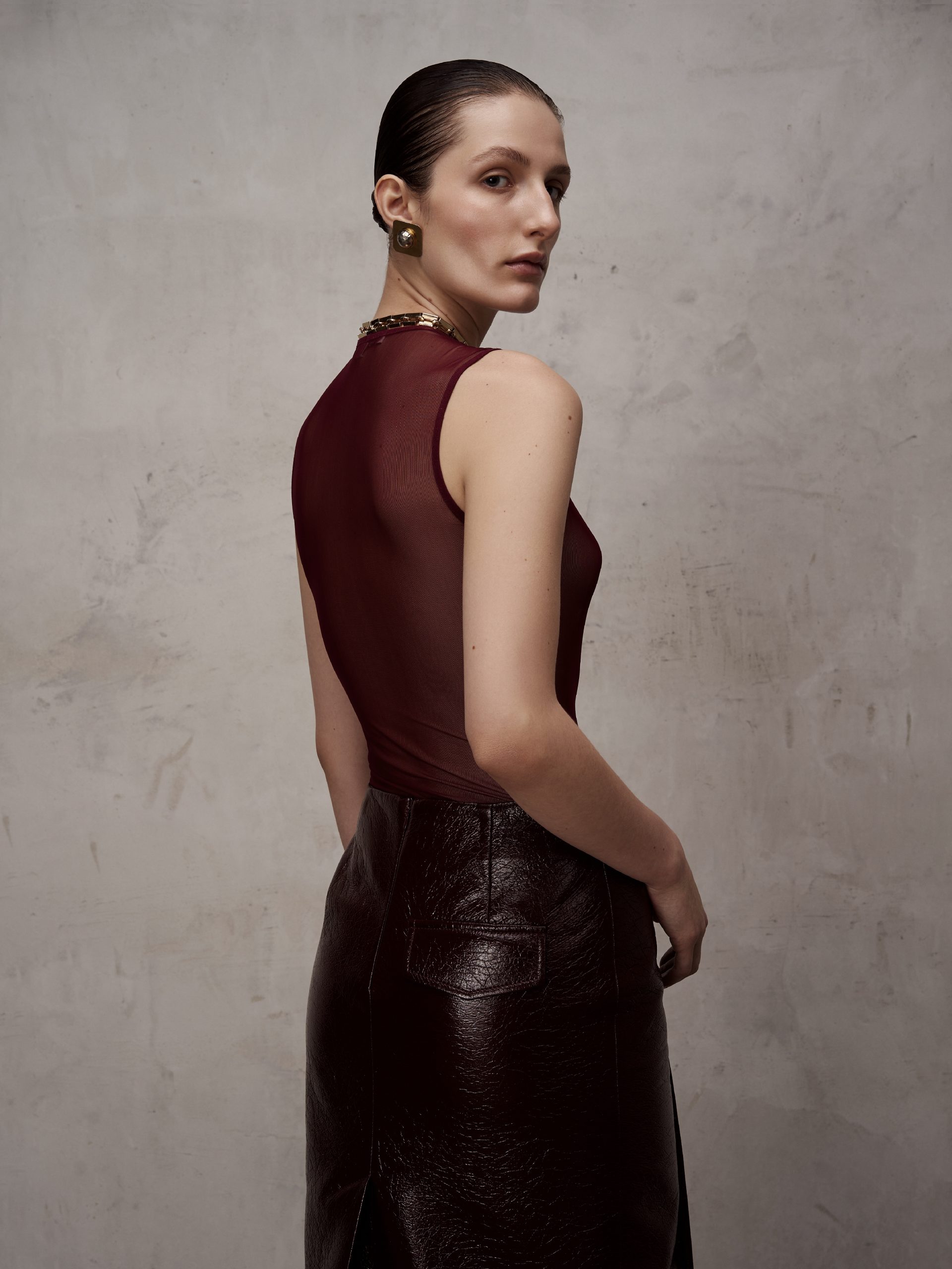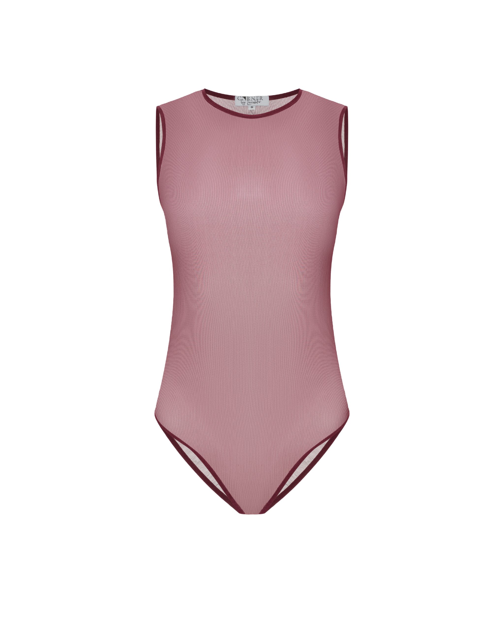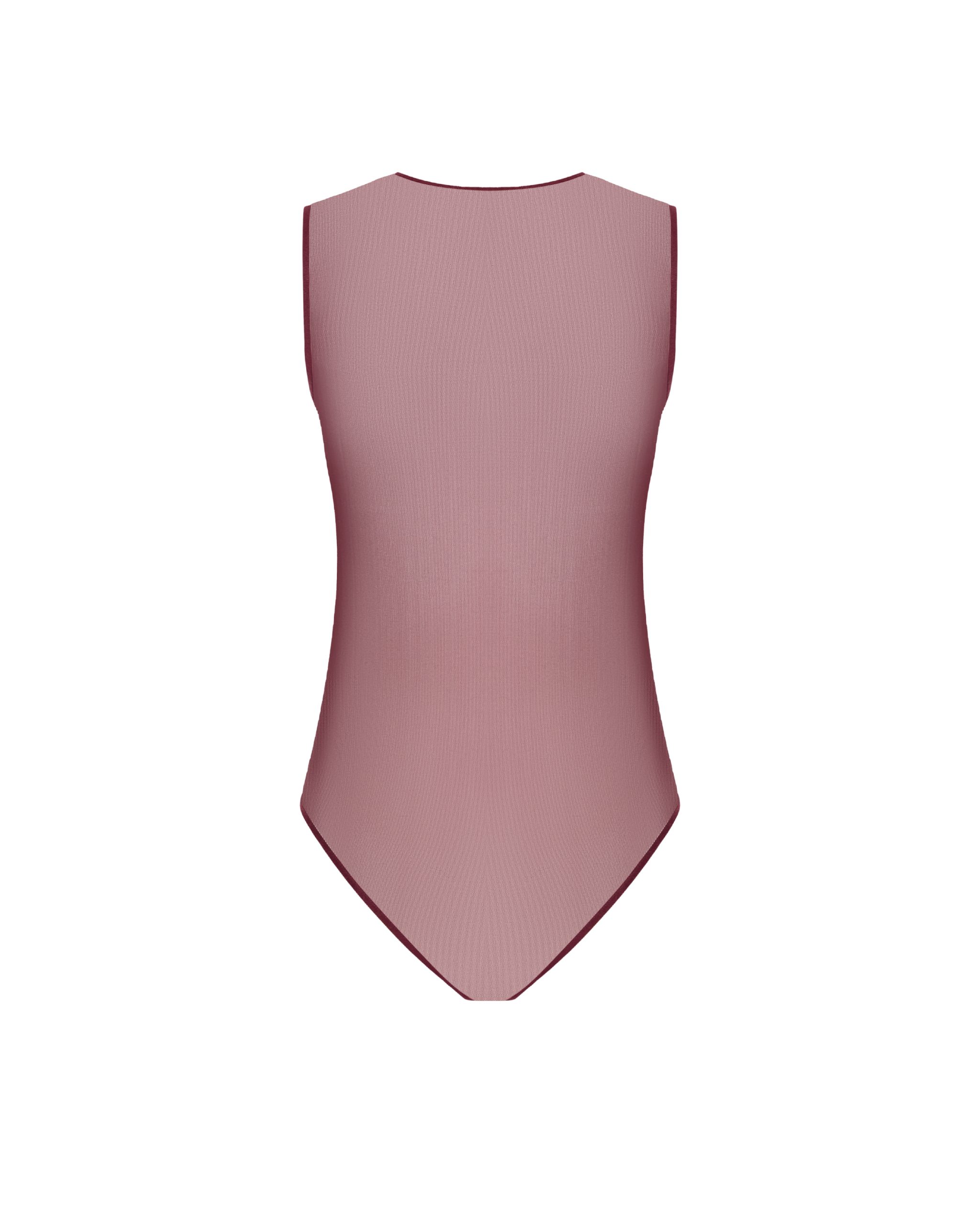 Напівпрозоре боді, виготовлене з мʼякої сітки. Виріб має круглу горловину та обробку еластичною бейкою. Застібається на пришивну тасьму з гачками.