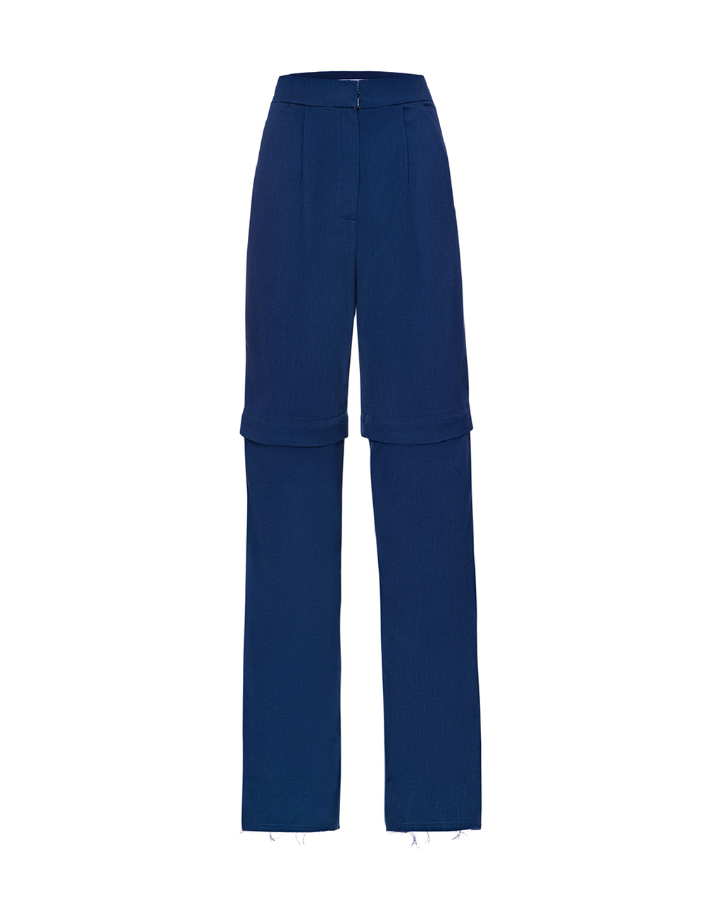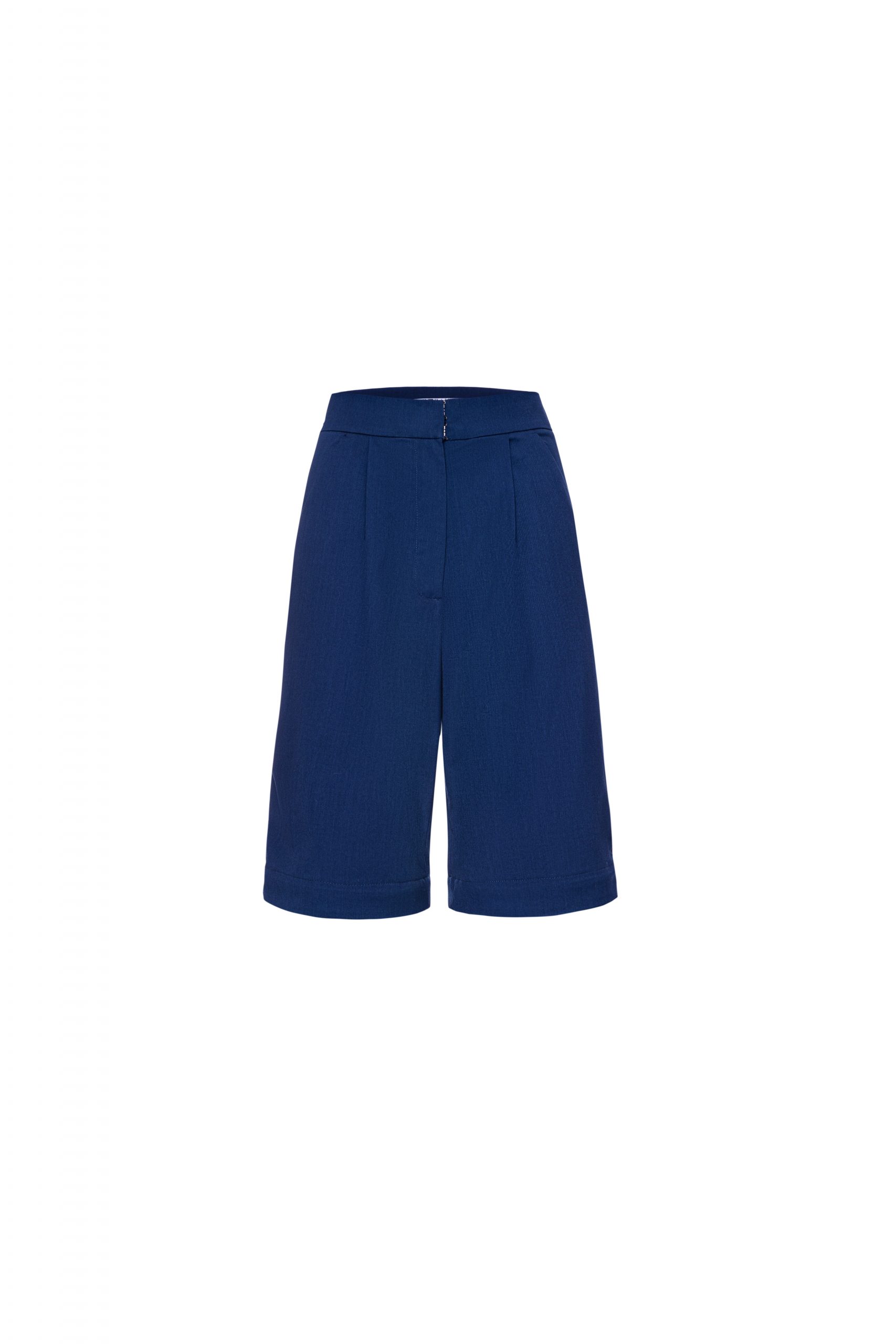 Штани-бермуди на відрізному поясі, помірного об’єму, прямого силуету. Застібка гульфік, на поясі-гачок та петля, є кишені. Штанини пристібаються на потайні гудзики