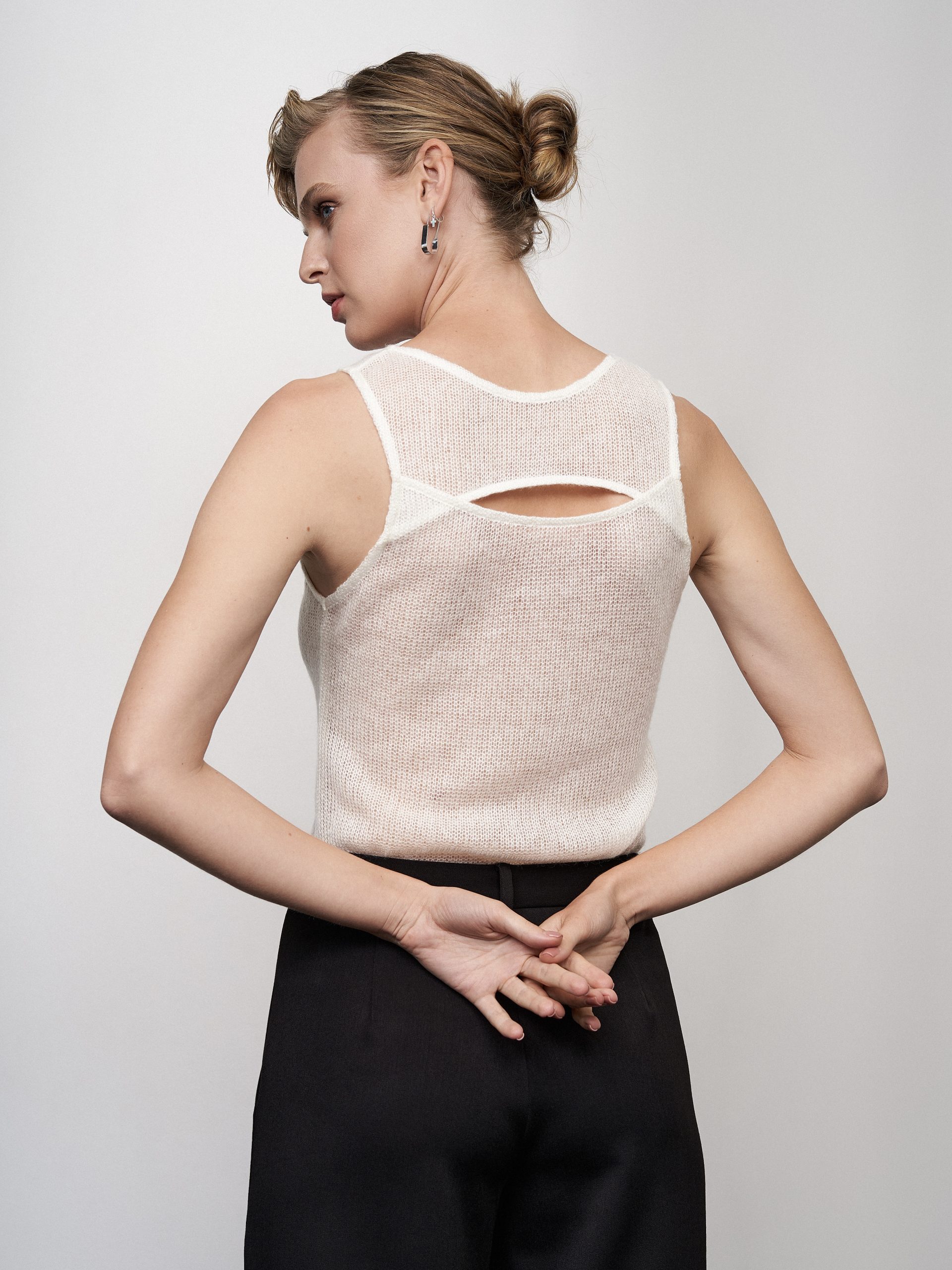 Майка двостороння з в’язаного трикотажу. Виріб сконструйований таким чином, щоб його можна було носити на дві сторони-з глибоким вирізом на грудях або в закритому варіанті-з вирізом «крапля». Зрізи оброблені бейкою. Довжина до лінії стегон.