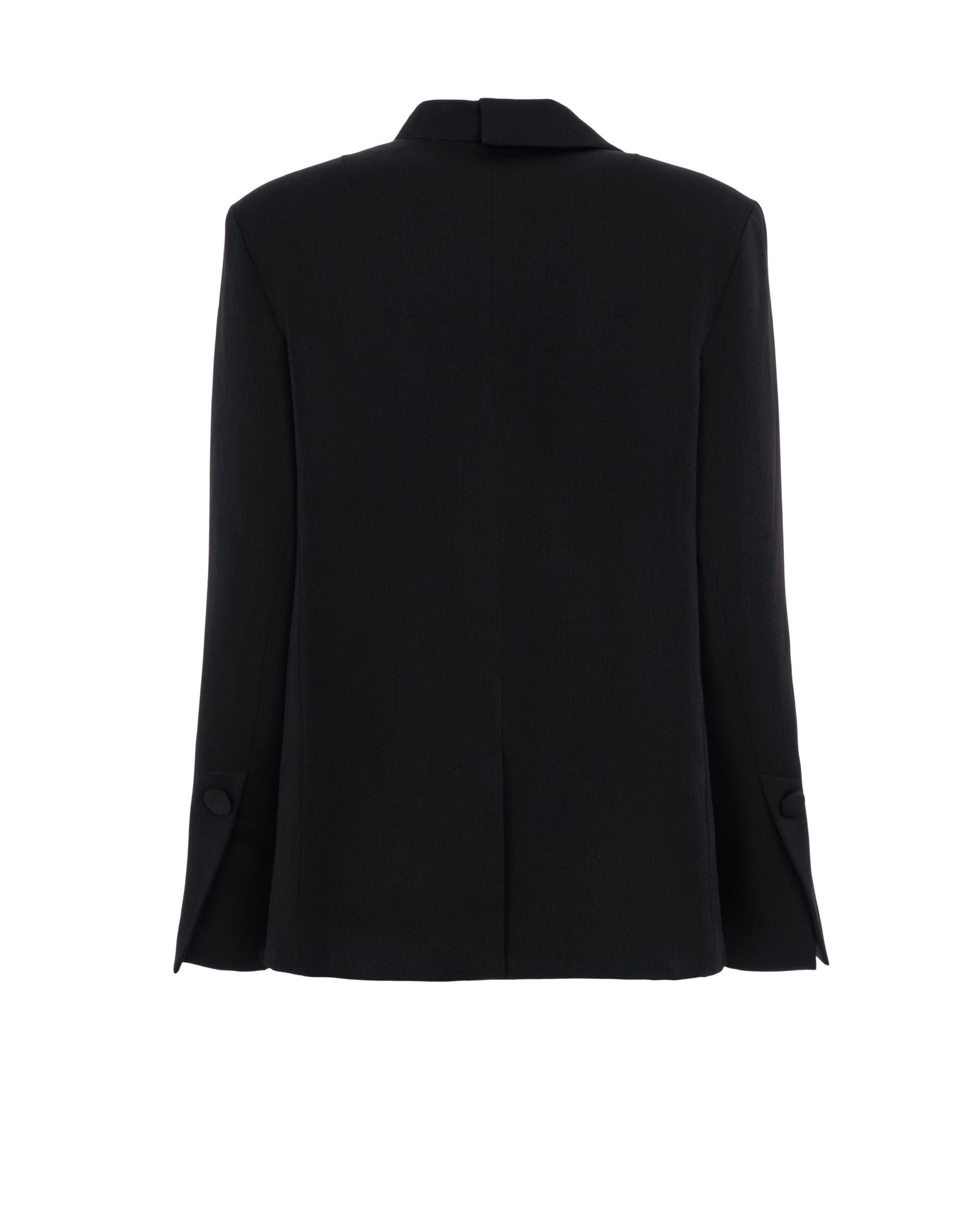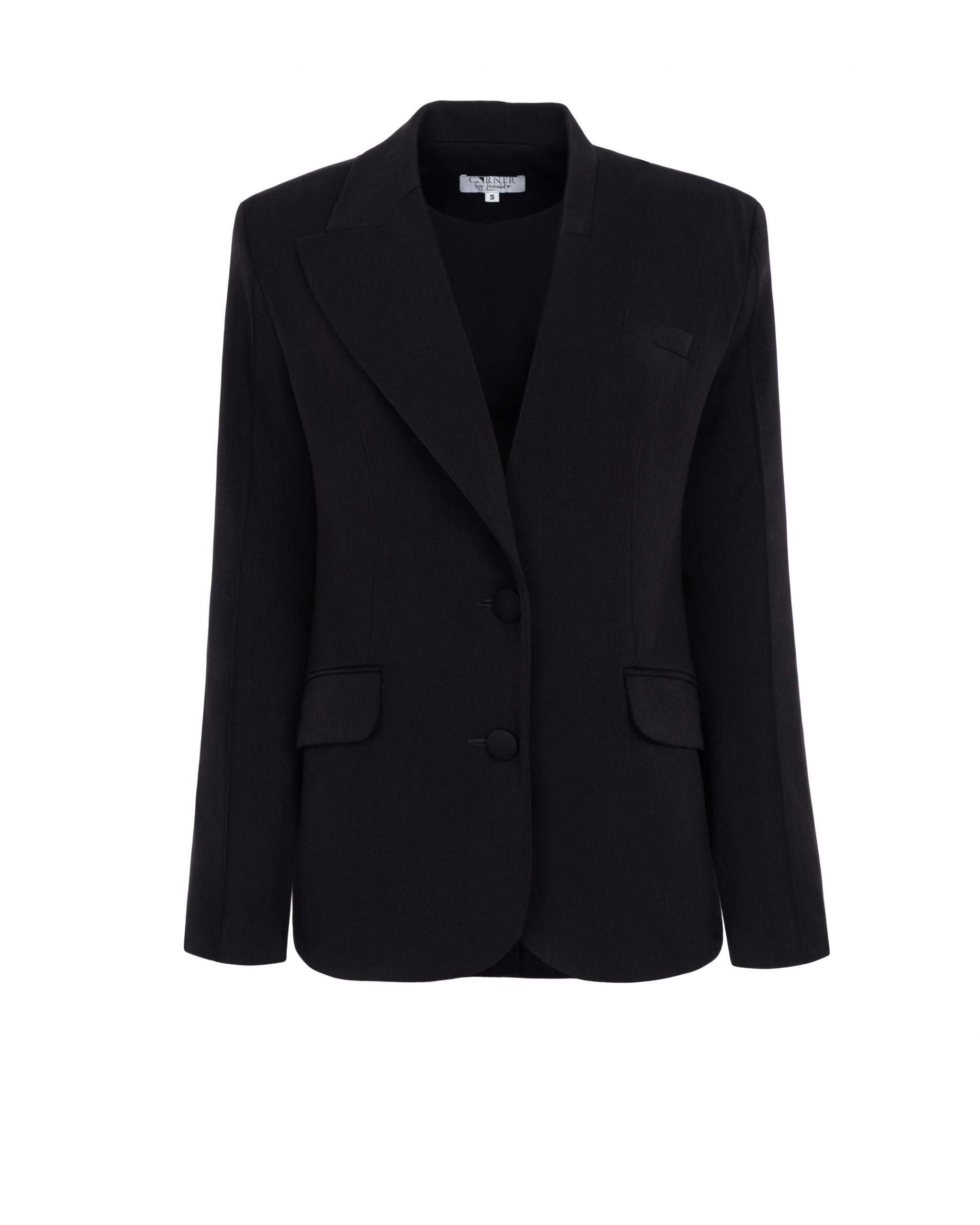 Однобортний жакет прямого крою, великого об’єму. Лінія плечей розширена, комір асиметричний з лацканом фігурної форми. Спереду-верхня кишеня з листочкою і дві прорізні кишені з клапанами, по середньому шву спинки-шлиця. Рукав двошовний з відкритою шліцею.
