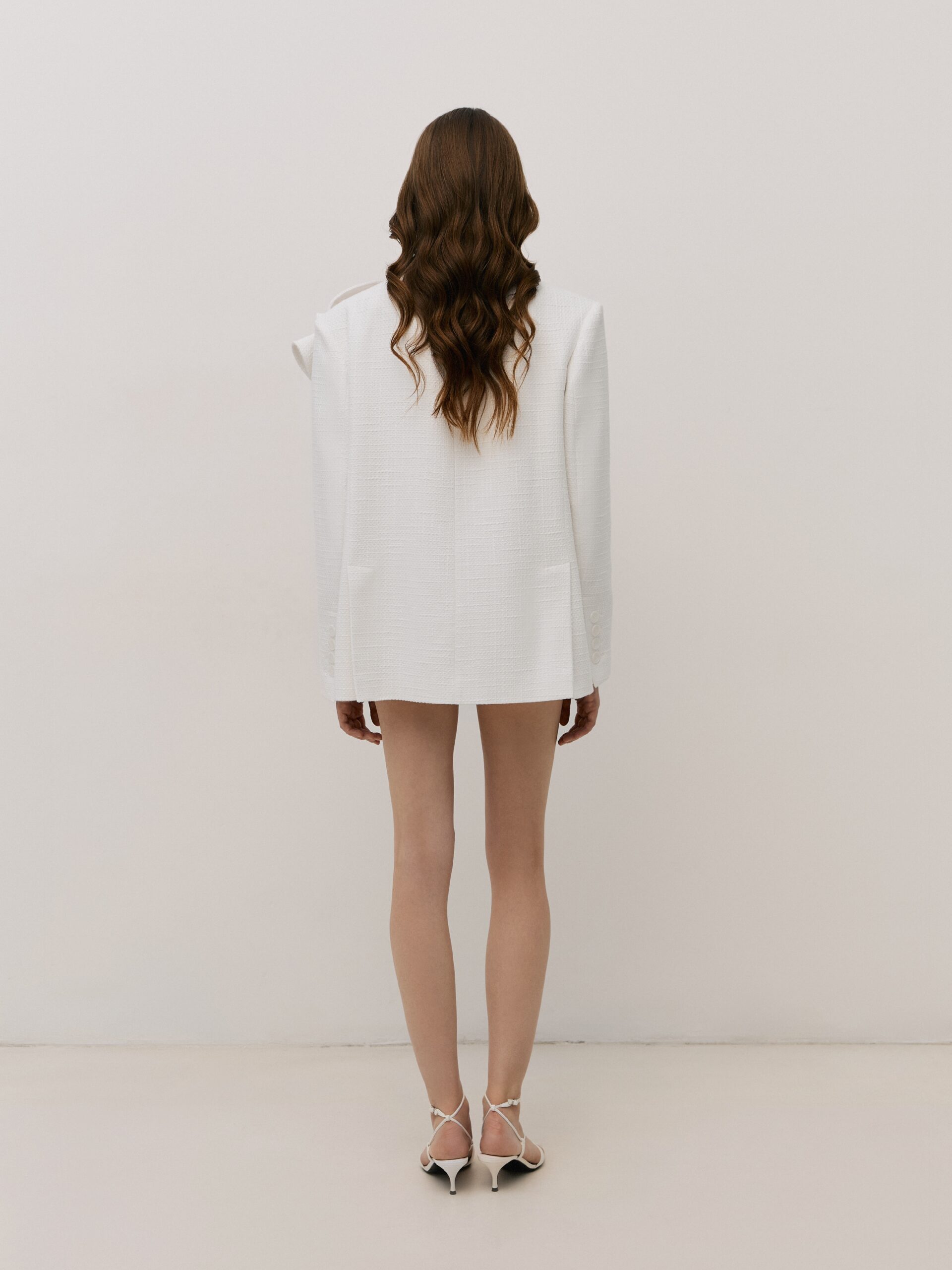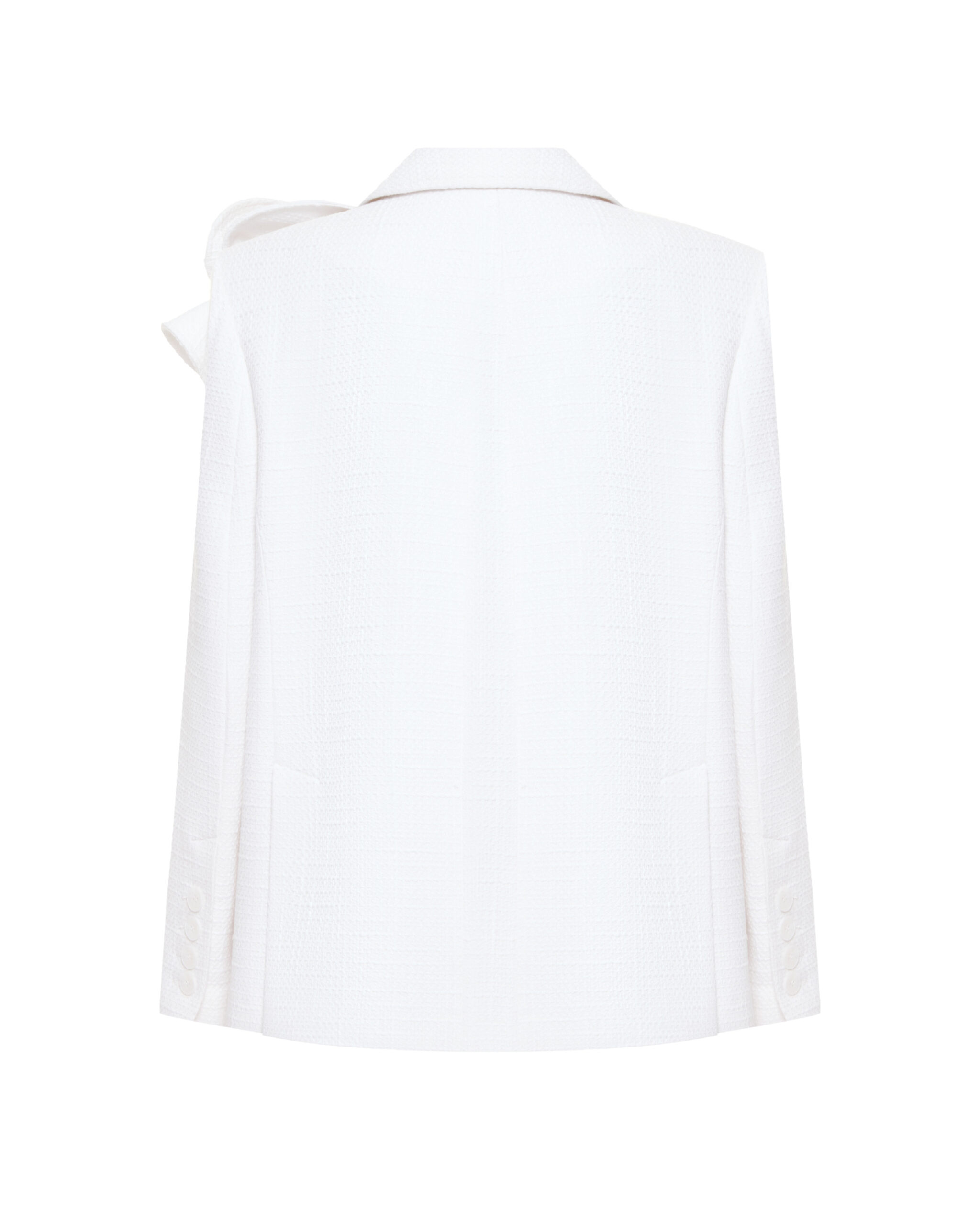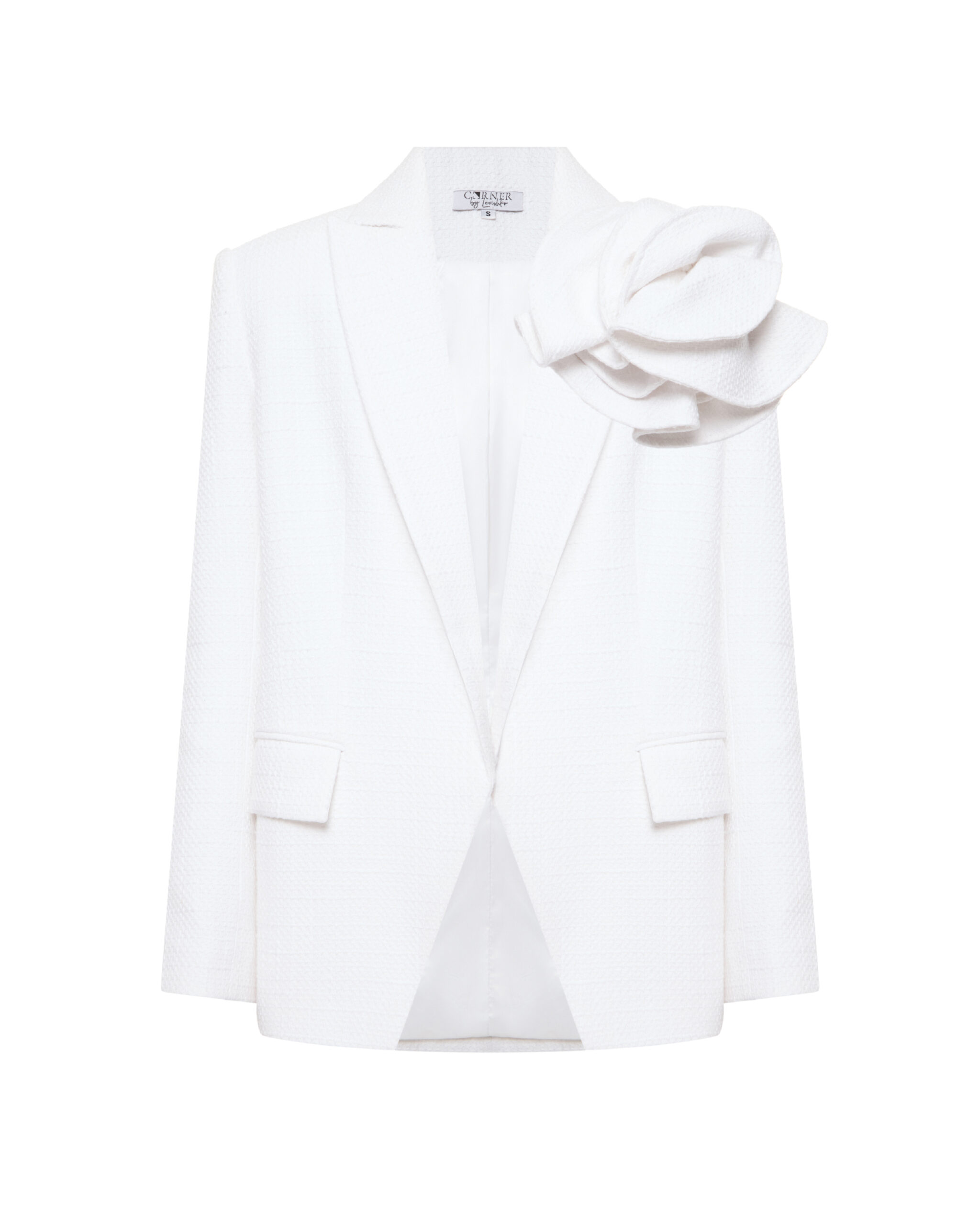 Однобортний жакет прямого крою, виготовлений із фактурної бавовни на підкладці. Виріб має архітектурну розширену лінію плеча, фігурні лацкани та функціональні кишені з клапанами. Декорований знімною об’ємною квіткою, що кріпиться на плече як брошка. Рукав— двошовний. Без застібки. Довжина жакета до середини стегна.