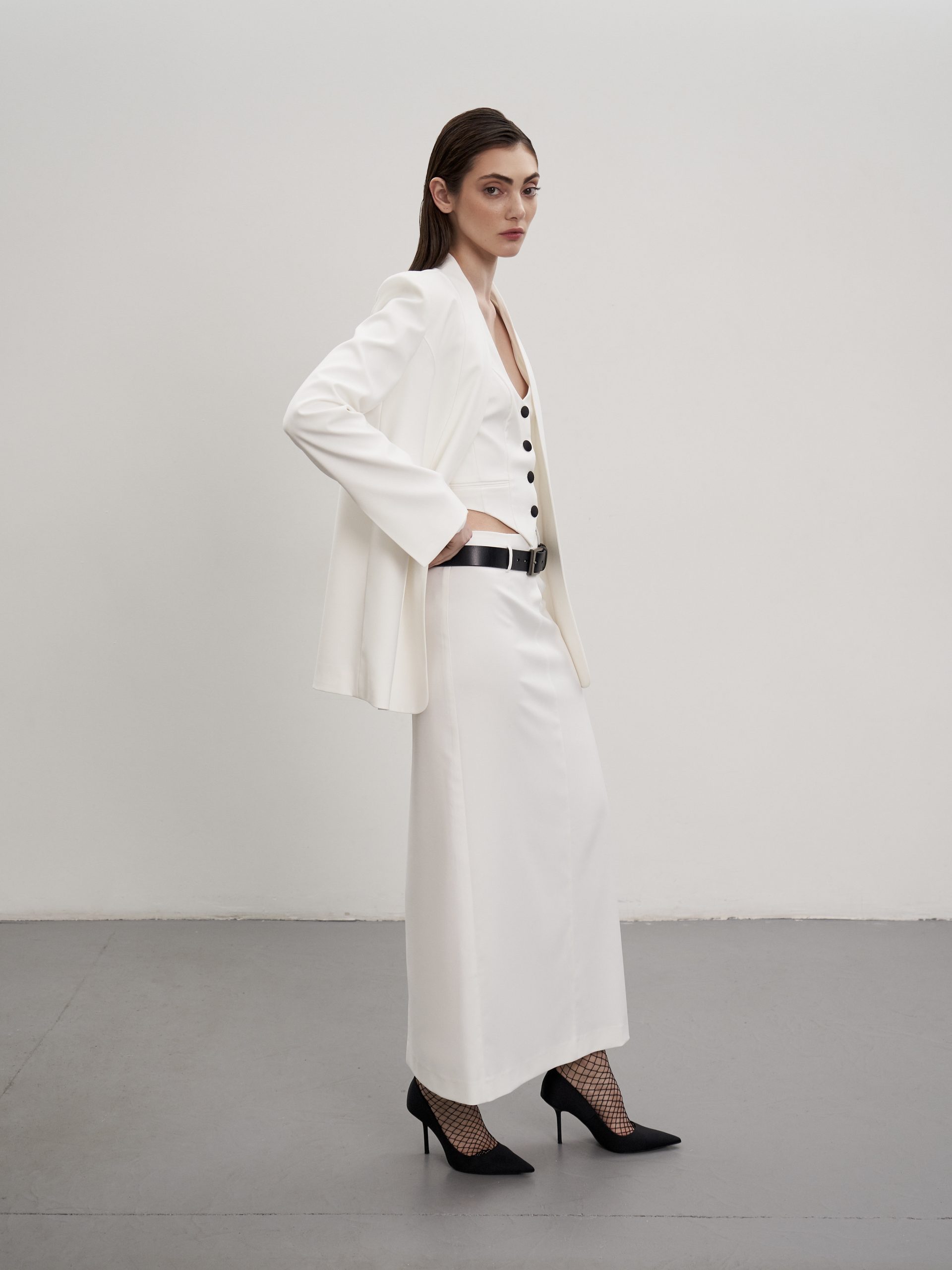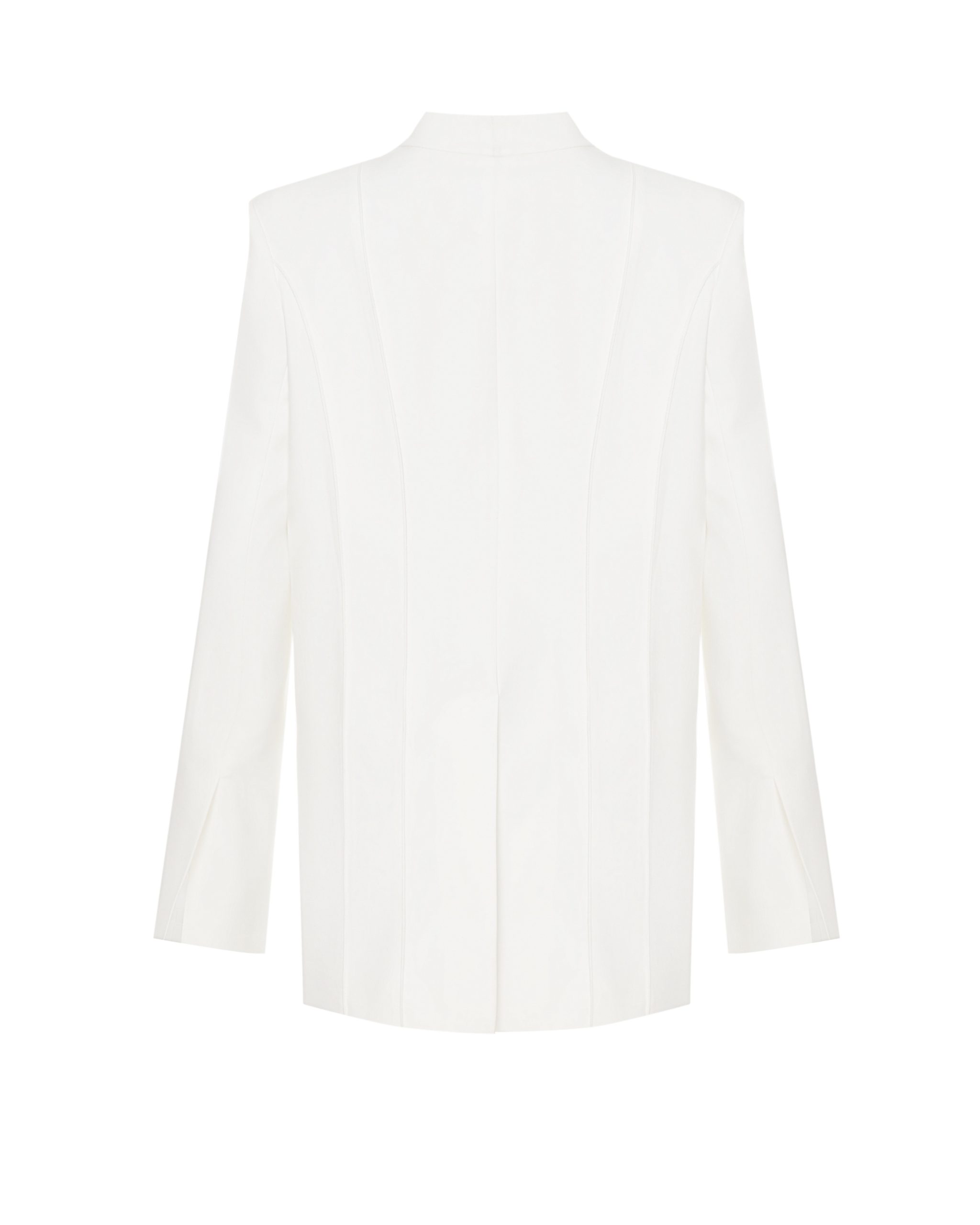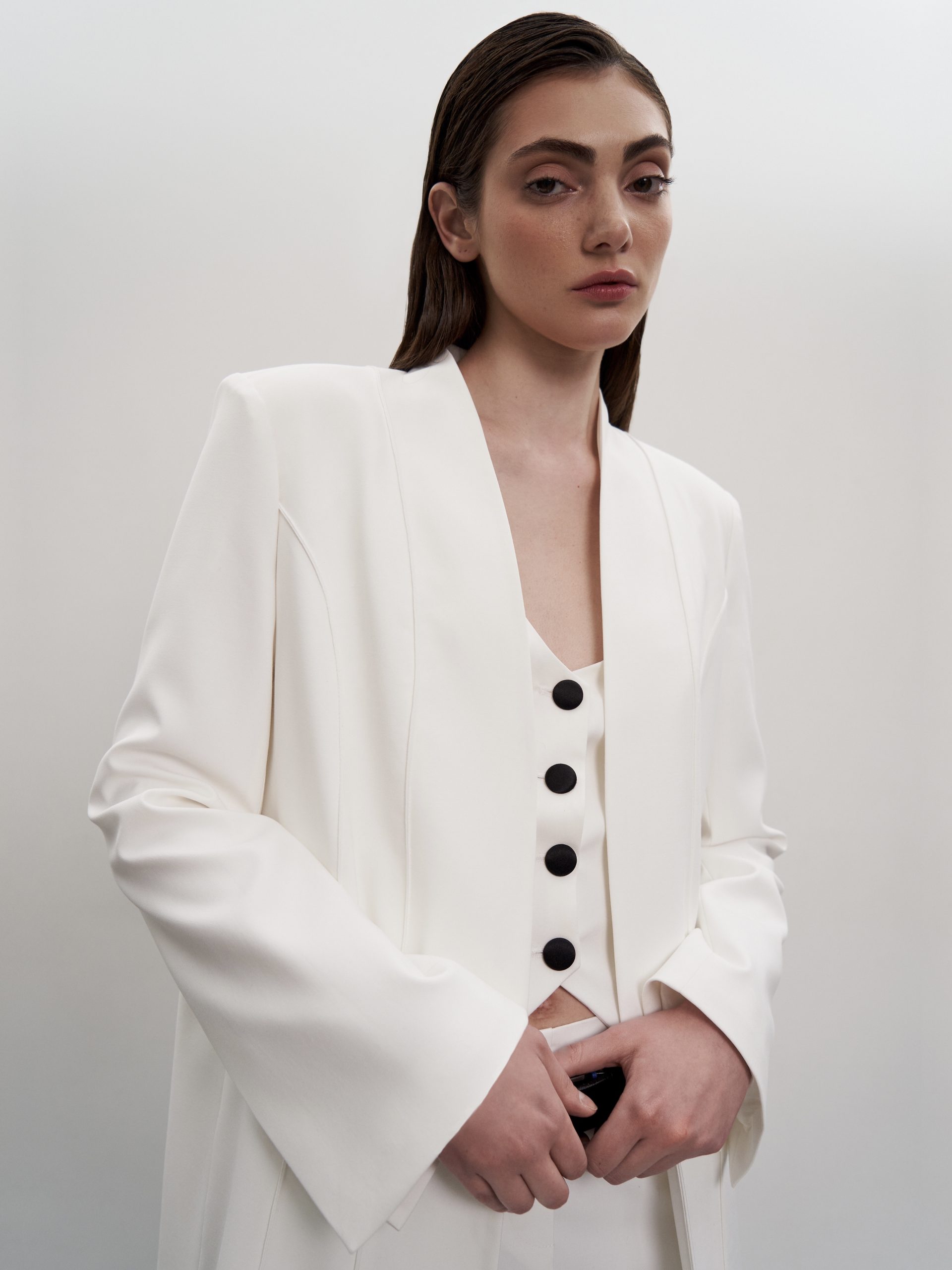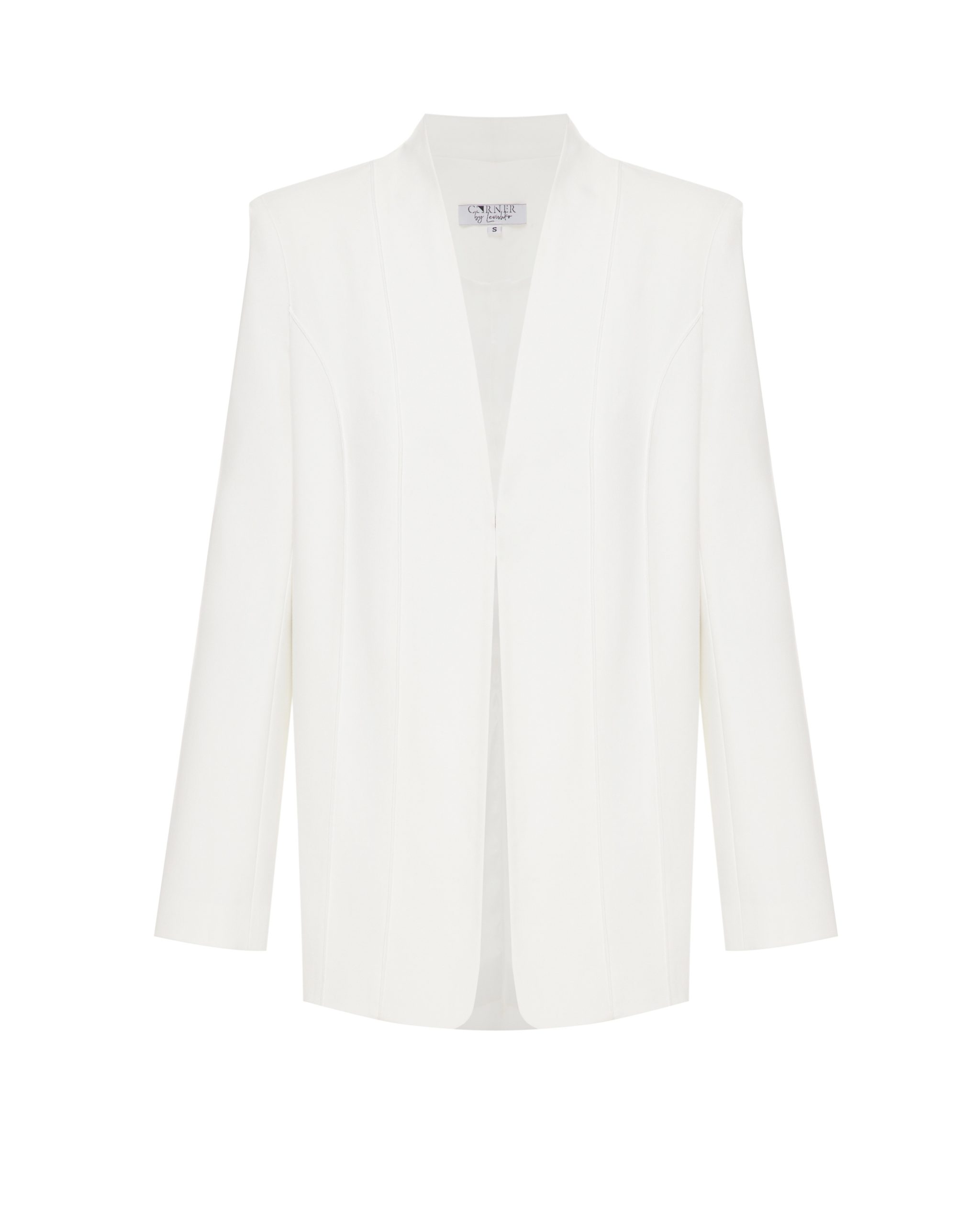 Елегантний жакет прямого силуету на підкладці. Деталі переда та спинки містять рельєфи з декоративним відстроченням. Комір- стійка, що переходить у край борту. Рукав двошовний з відкритою шлицею. Жакет без застібки, довжина виробу до середини стегна.