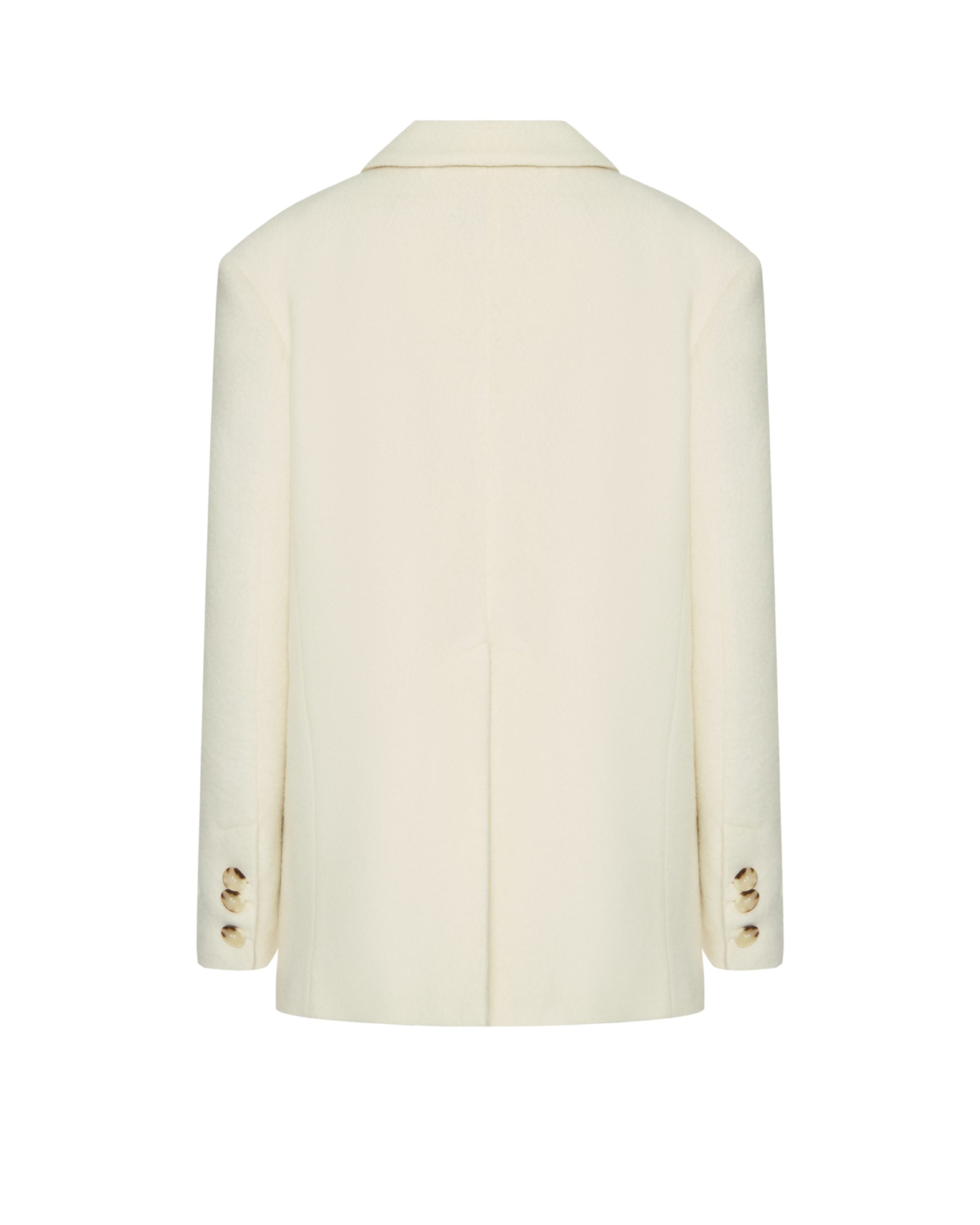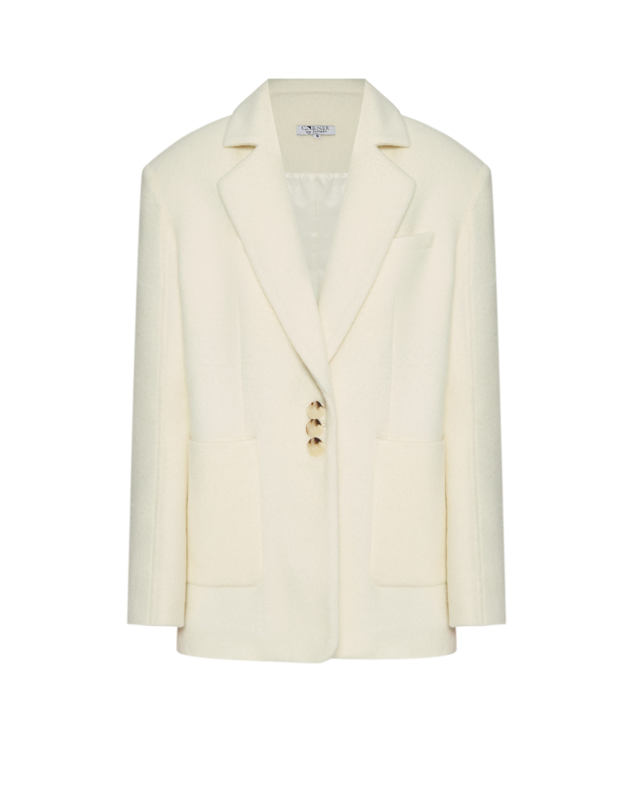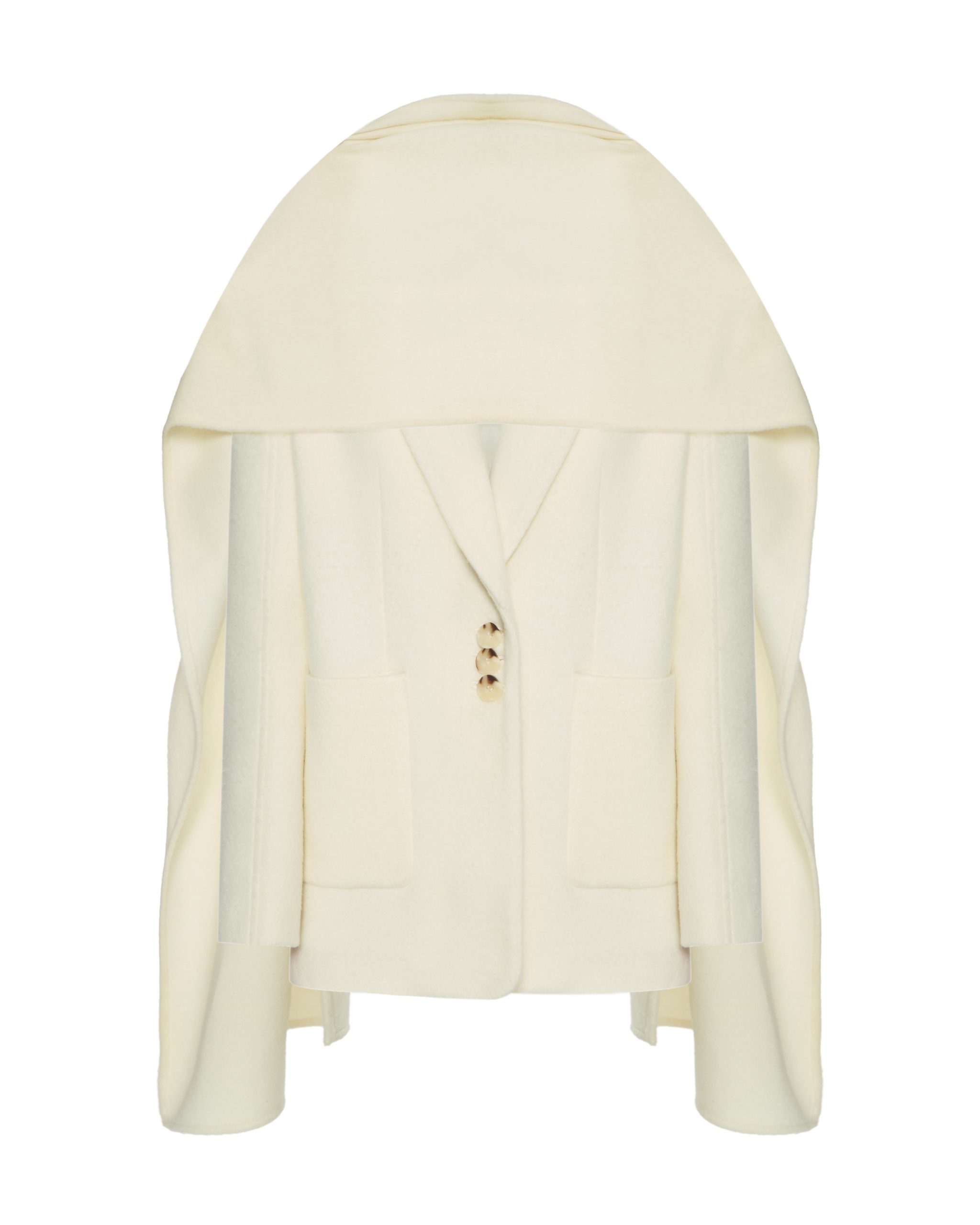 Однобортний жакет-пальто прямого крою, виготовлений з пальтового мʼякого кашеміру на підкладці. Виріб має архітектурну розширену лінію плеча та накладні кишені; на спинці– відлітна шліца. Рукав двошовний з декоративним відстроченням. Застібається на ґудзики, має шарф-палантин у комплекті. Довжина жакету-пальто до середини стегна.