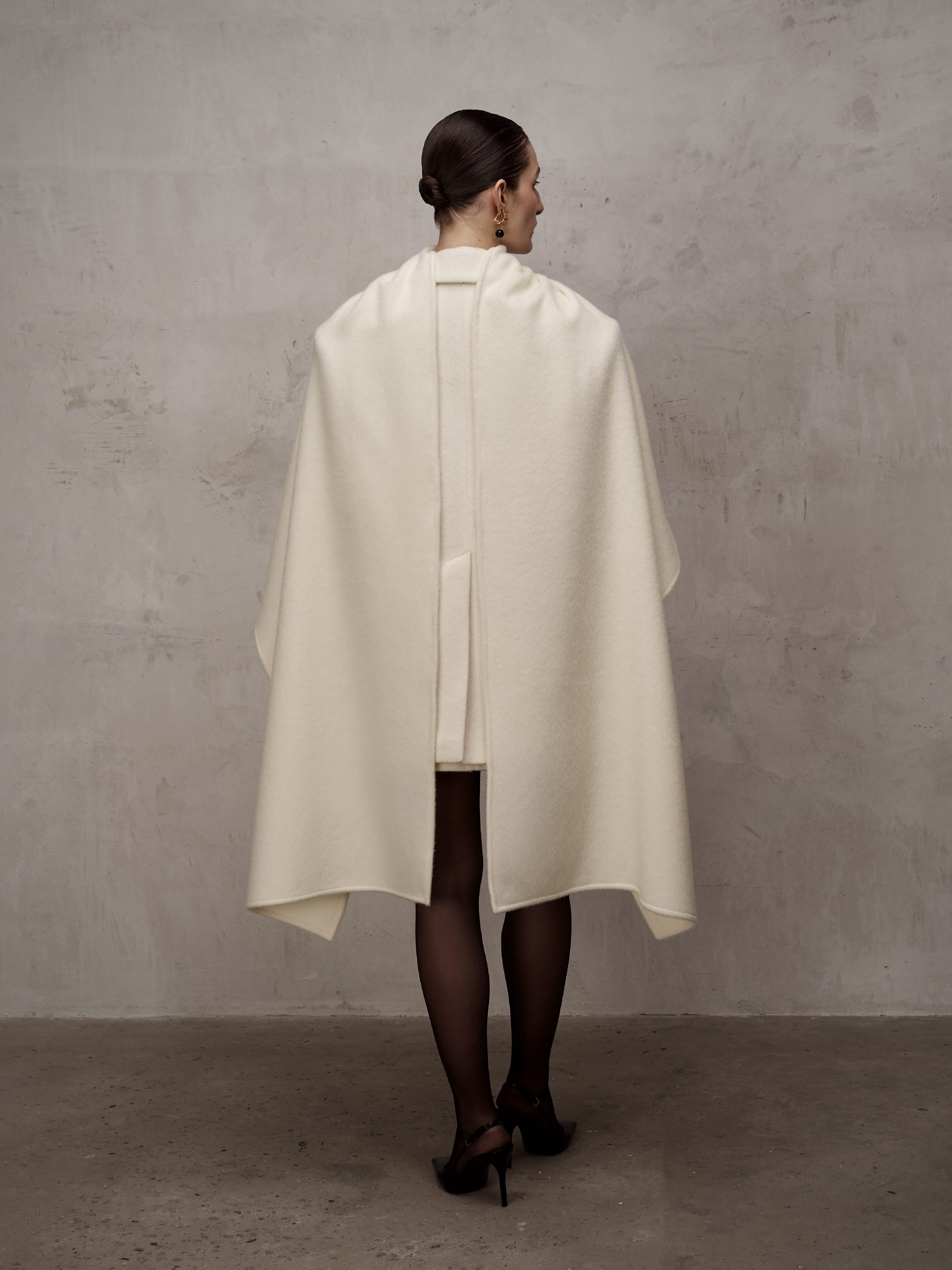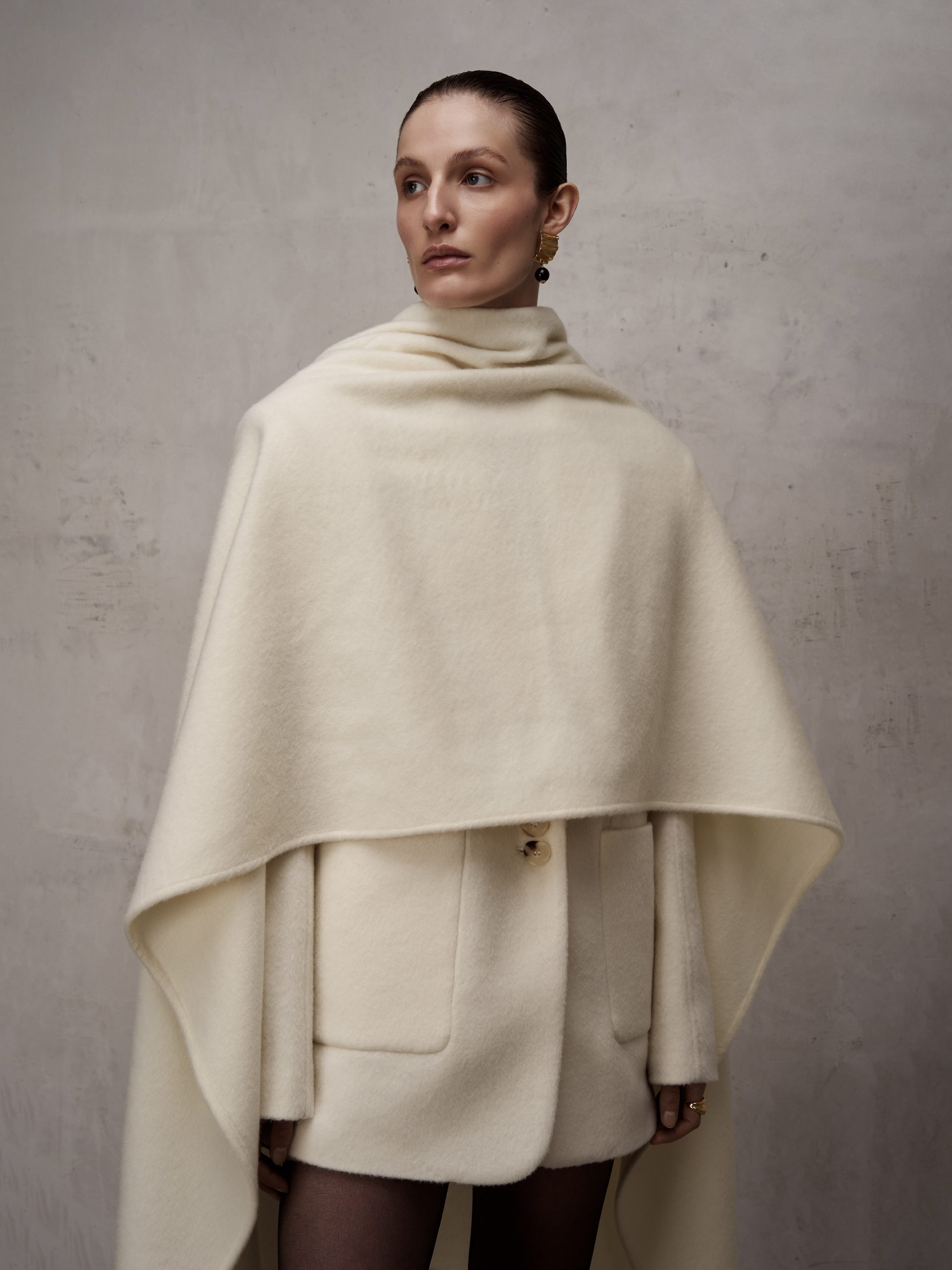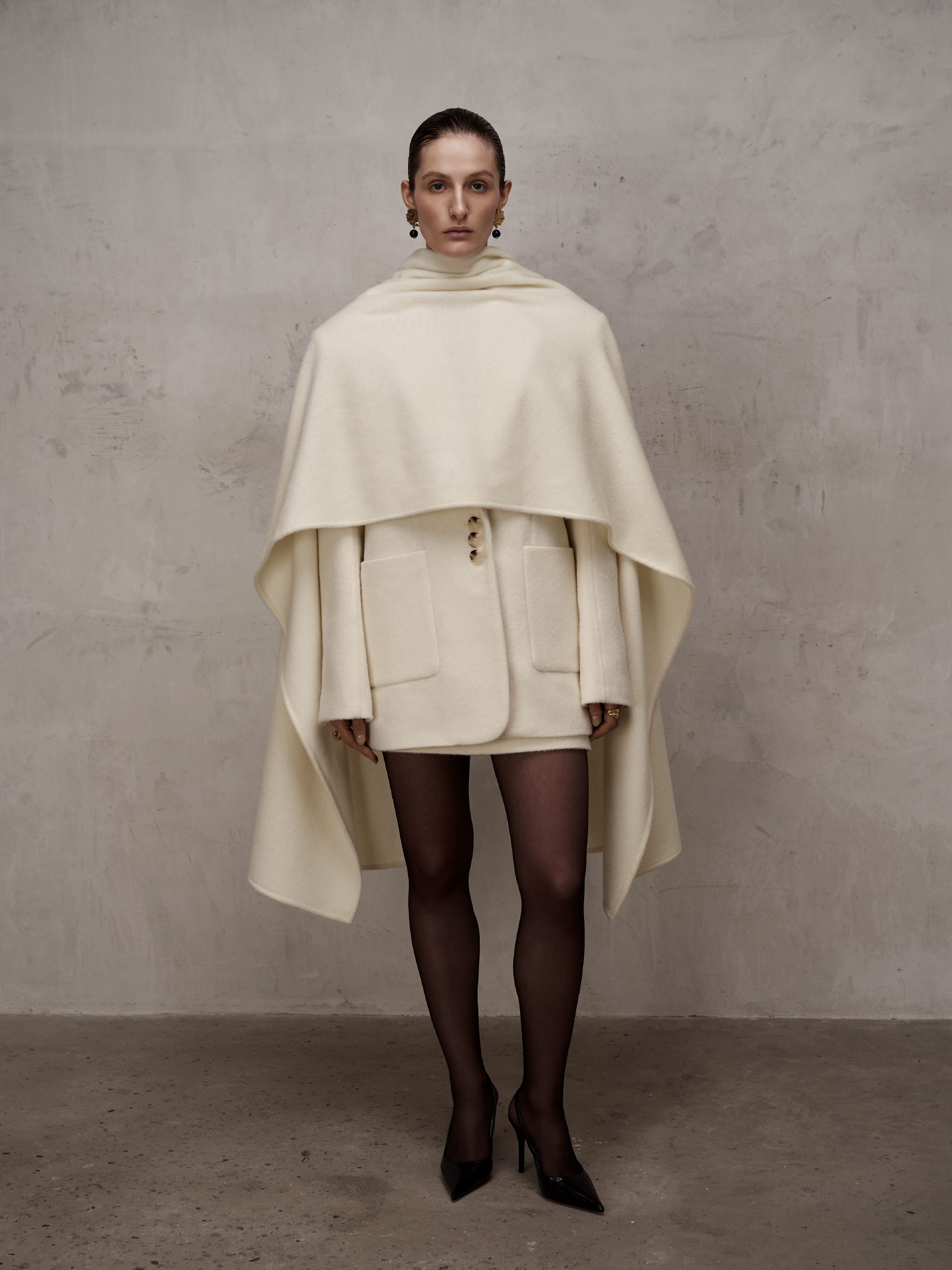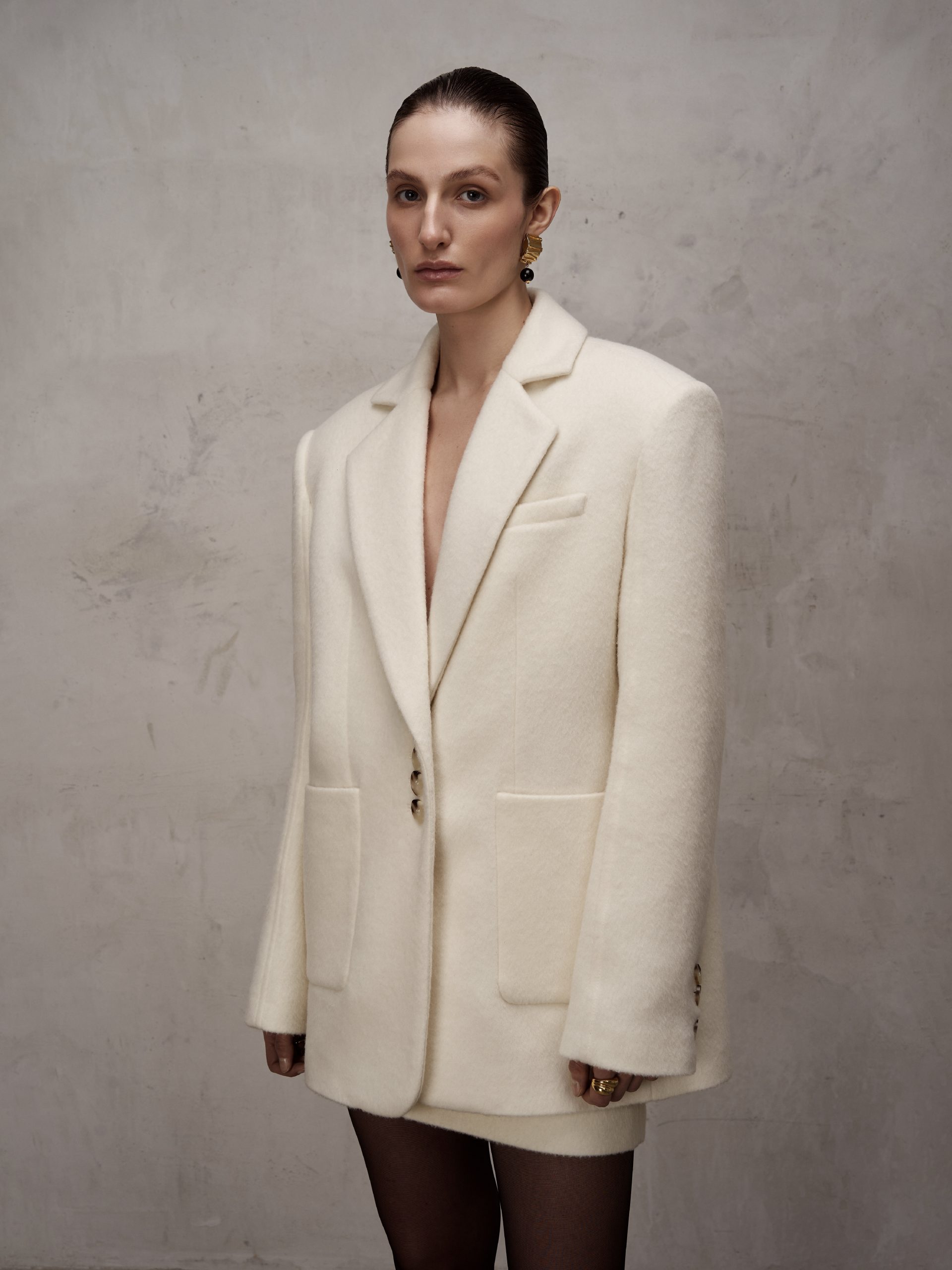 Однобортний жакет-пальто прямого крою, виготовлений з пальтового мʼякого кашеміру на підкладці. Виріб має архітектурну розширену лінію плеча та накладні кишені; на спинці– відлітна шліца. Рукав двошовний з декоративним відстроченням. Застібається на ґудзики, має шарф-палантин у комплекті. Довжина жакету-пальто до середини стегна.