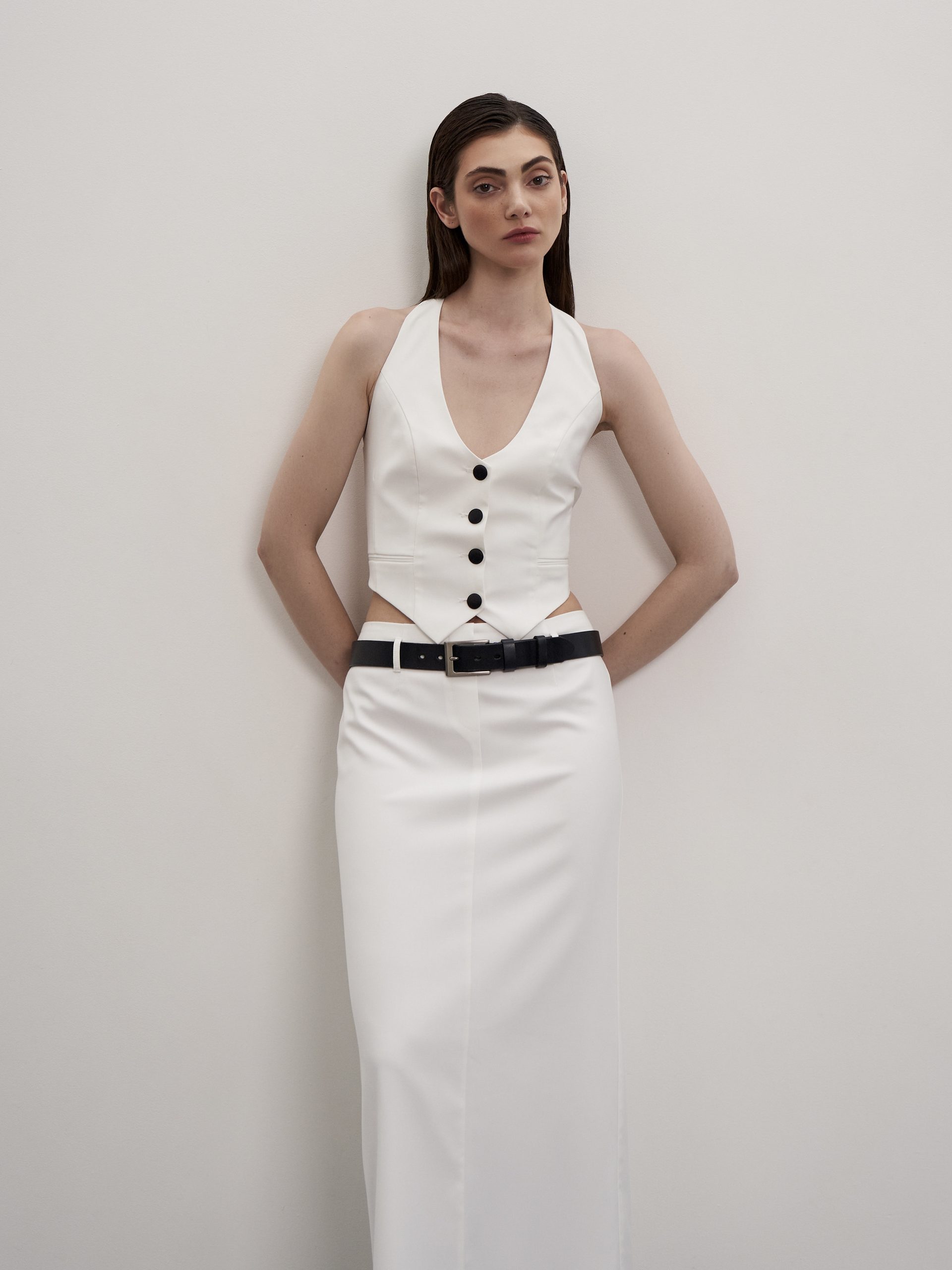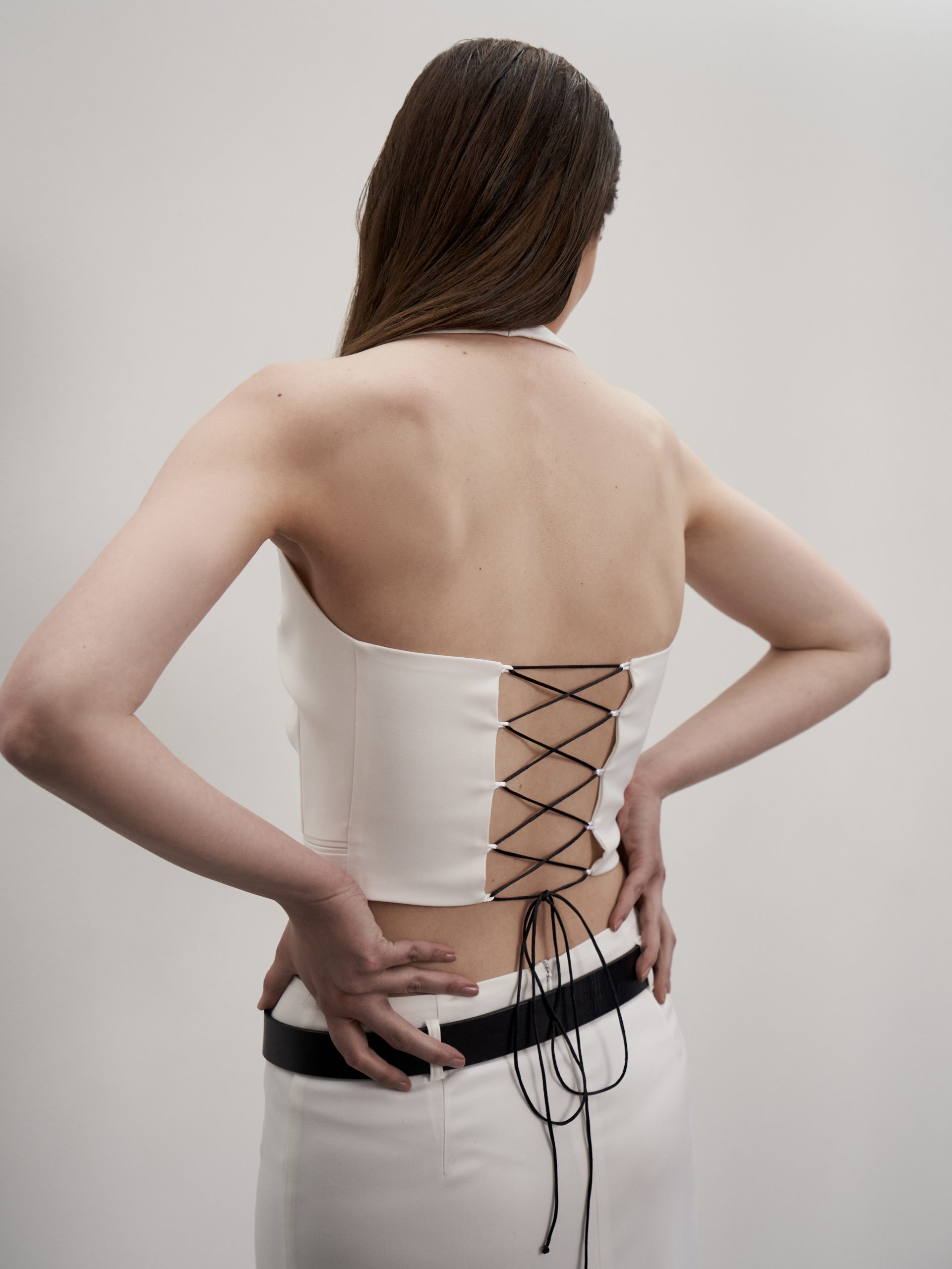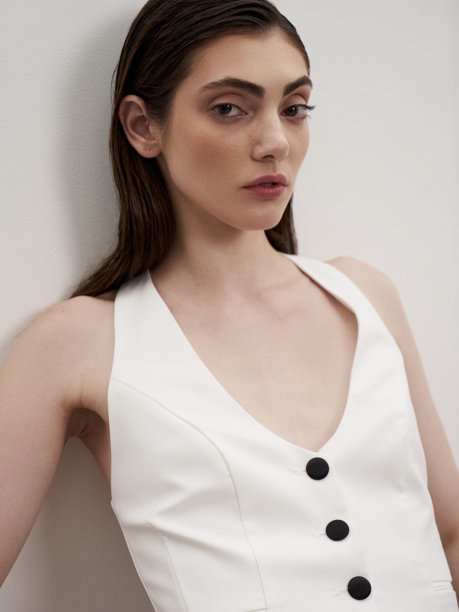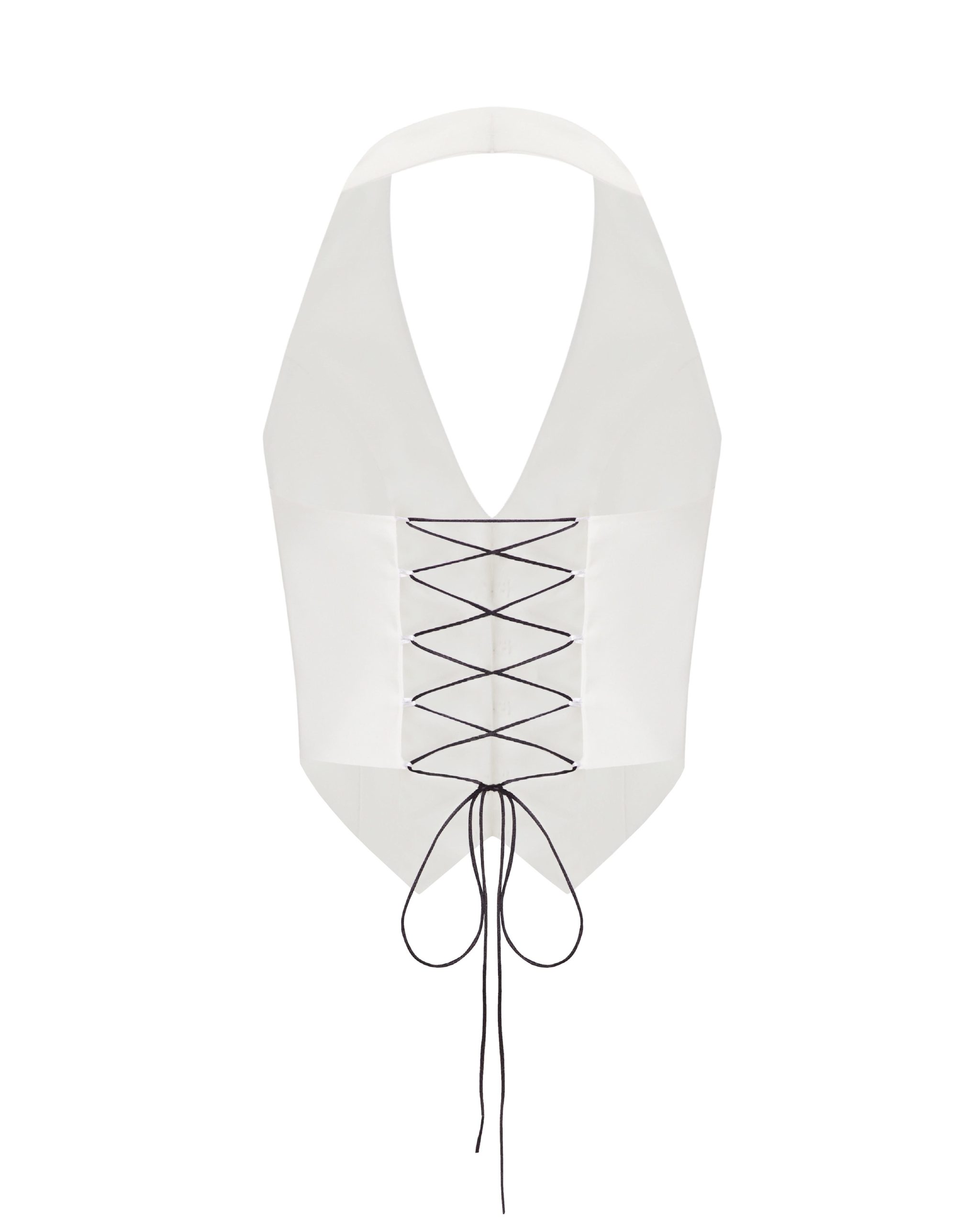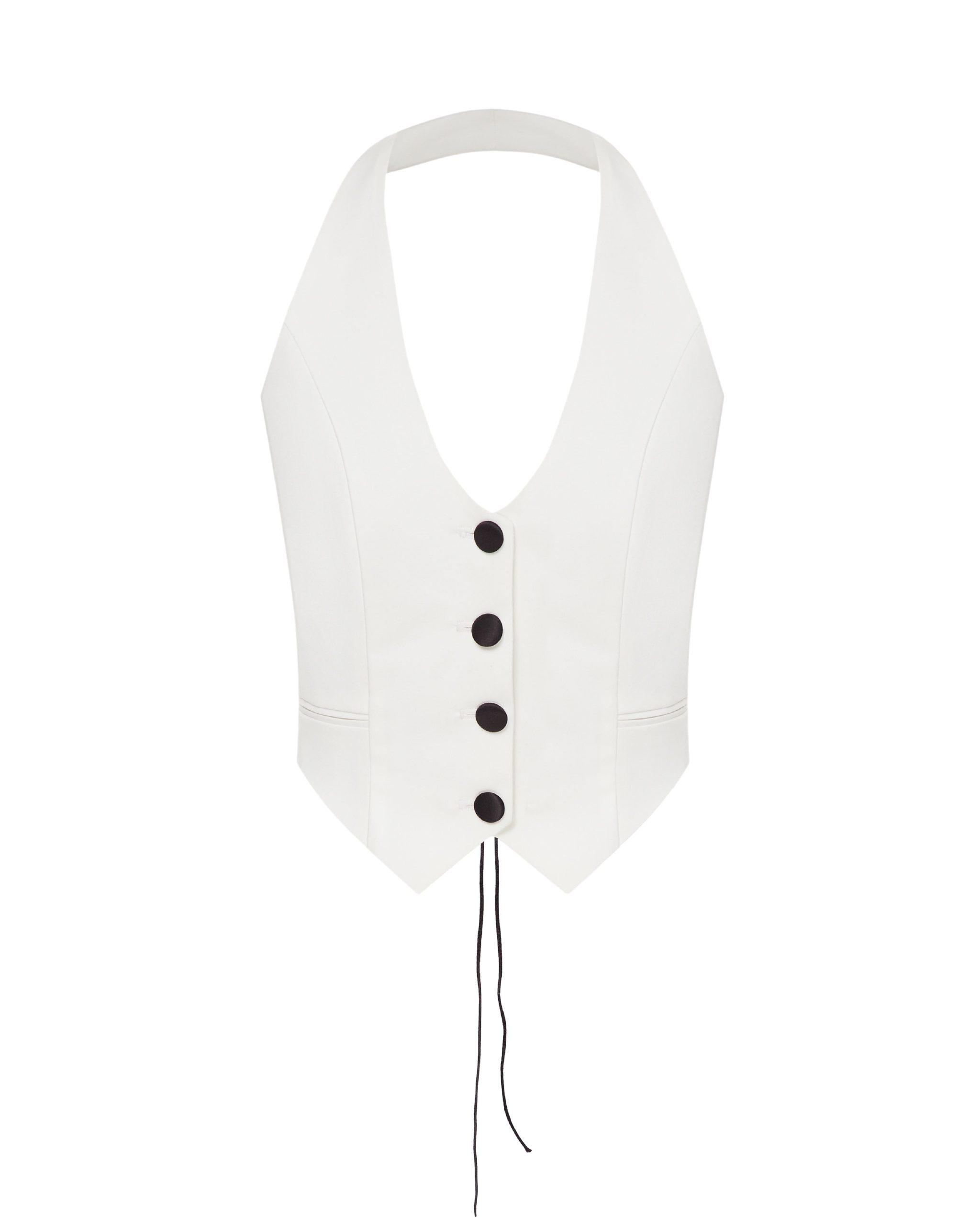 Жилет з відкритою спиною прилеглого силуету. Застібається на чотири ґудзики спереду та має шнурівку на спинці. Жилет виконаний з двох шарів тканини, завдяки чому відмінно тримає форму.
