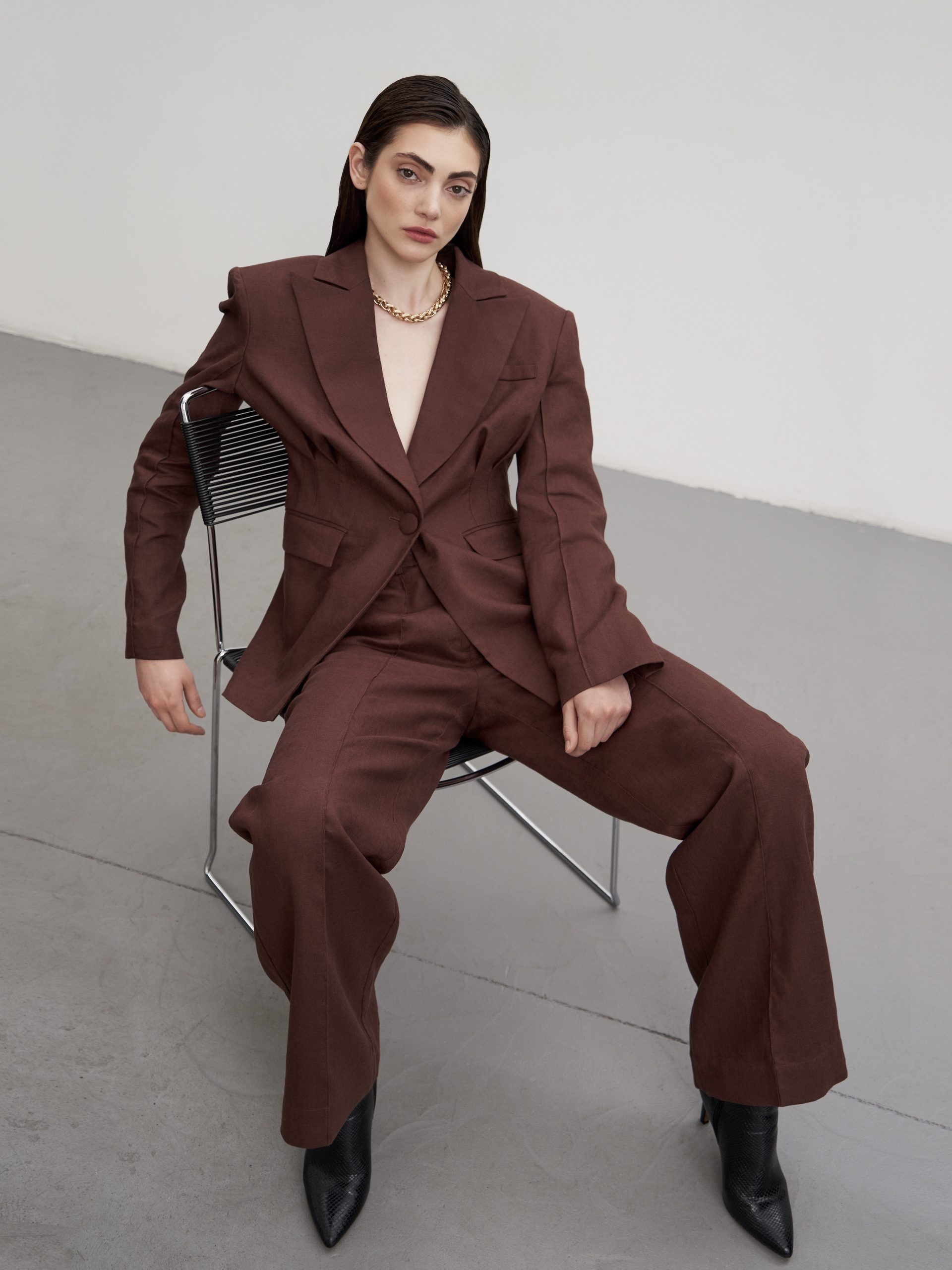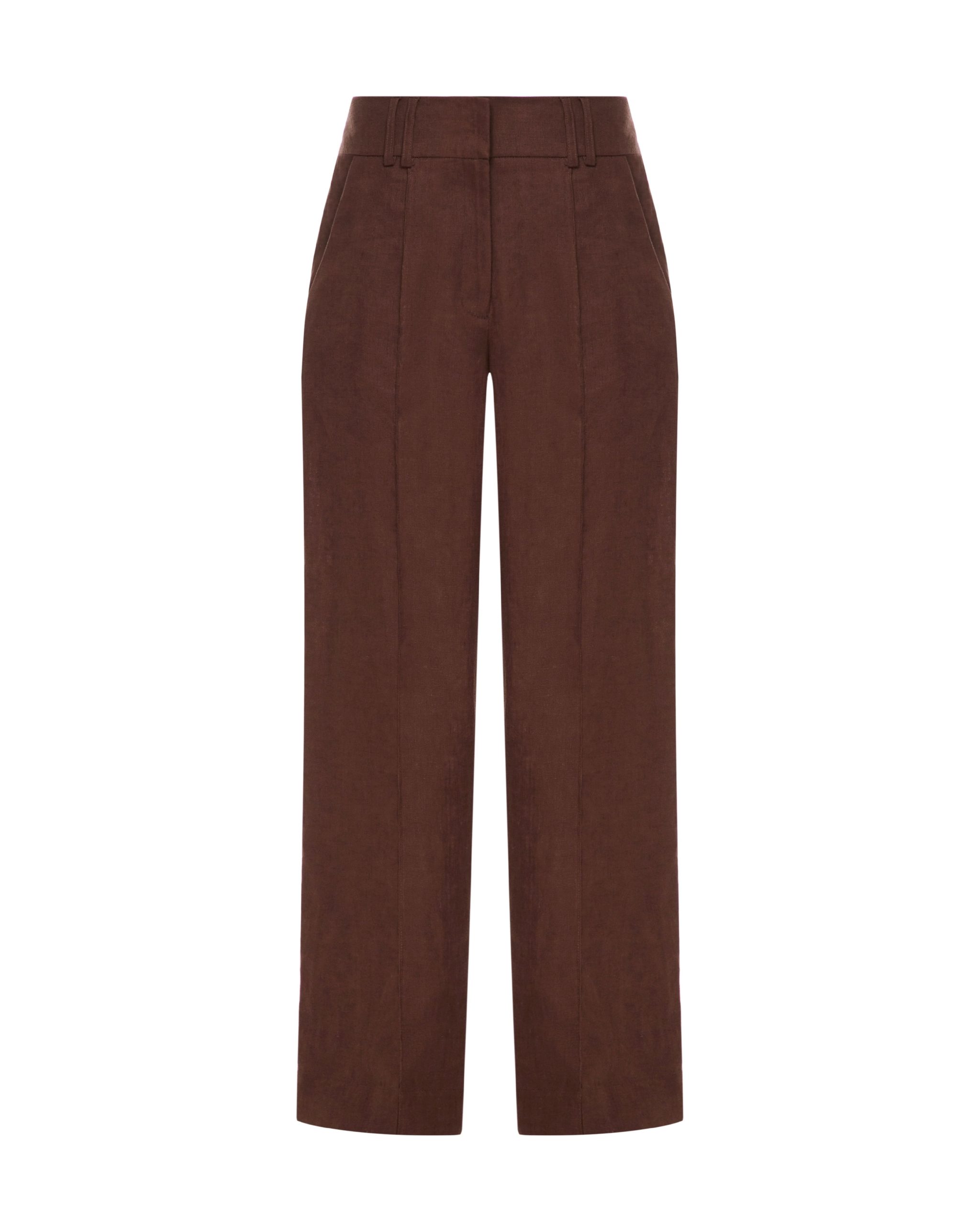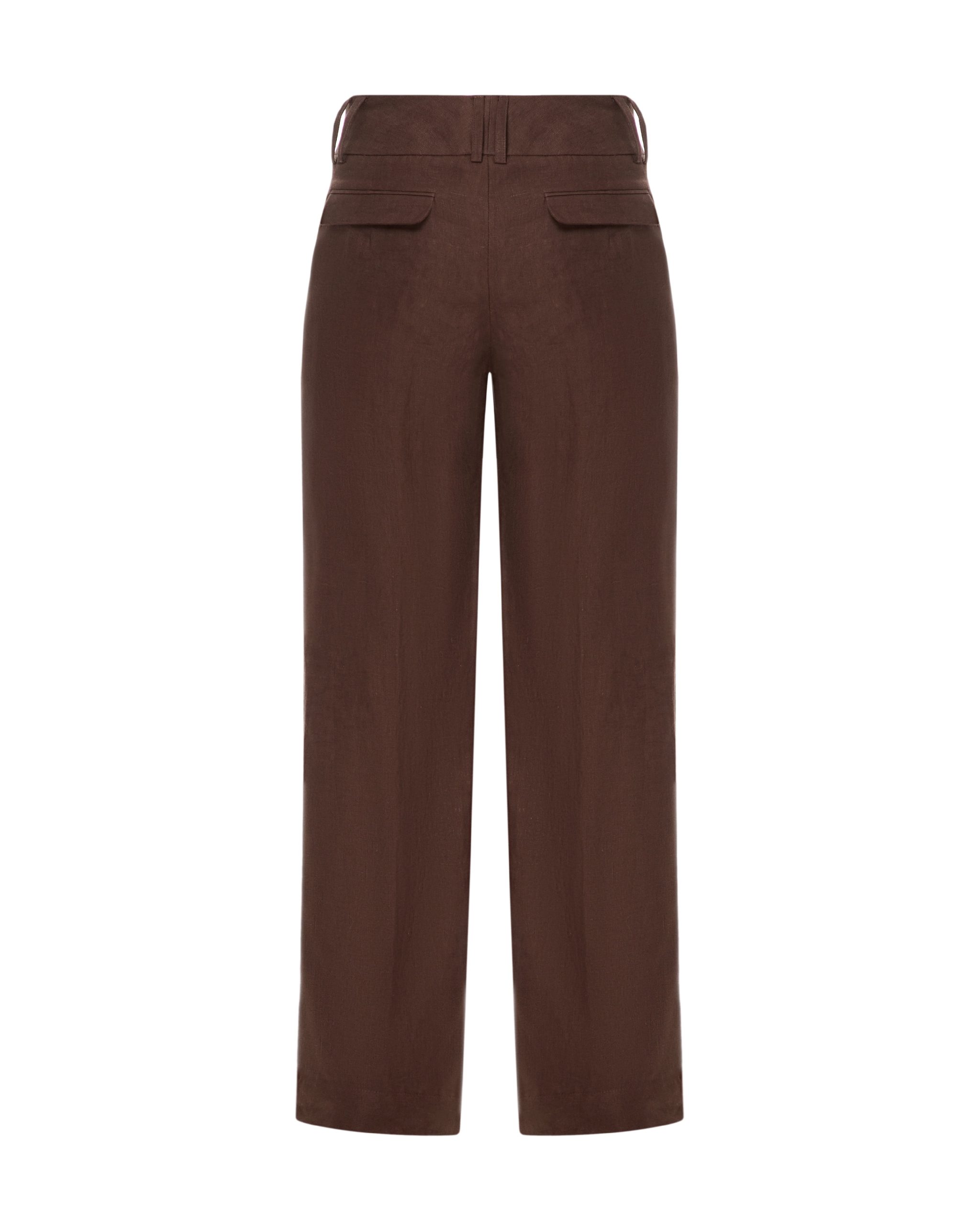 Льняні брюки прямого силуету за чоловічим типом, із застроченими стрілками. На передніх половинках брюк функціональні кишені з відрізним бочком, на задніх половинках- нефункціональні кишені з клапаном. Пояс широкий, на поясі – шльовки. Лінія талії занижена. Застібка- два пришивні гачки та дві петлі. Довжина брюк у підлогу з складкою, що закладається.