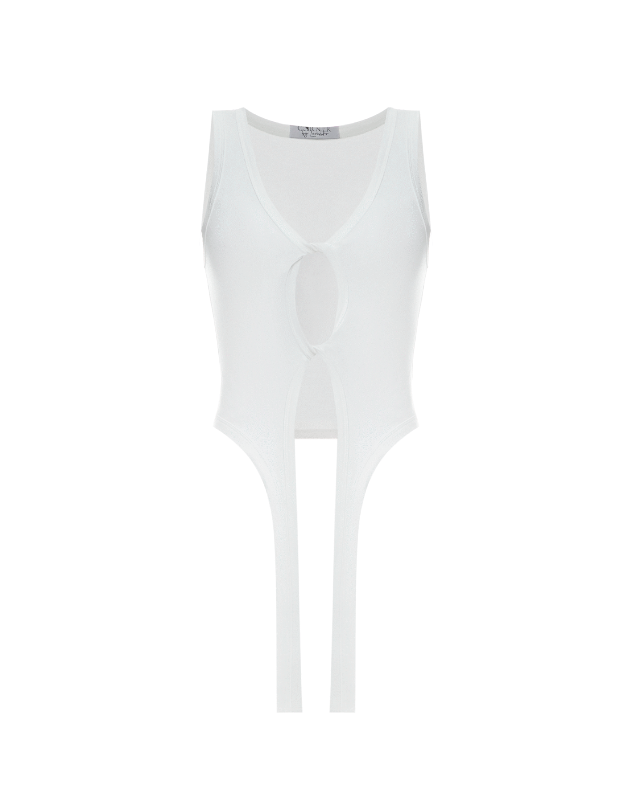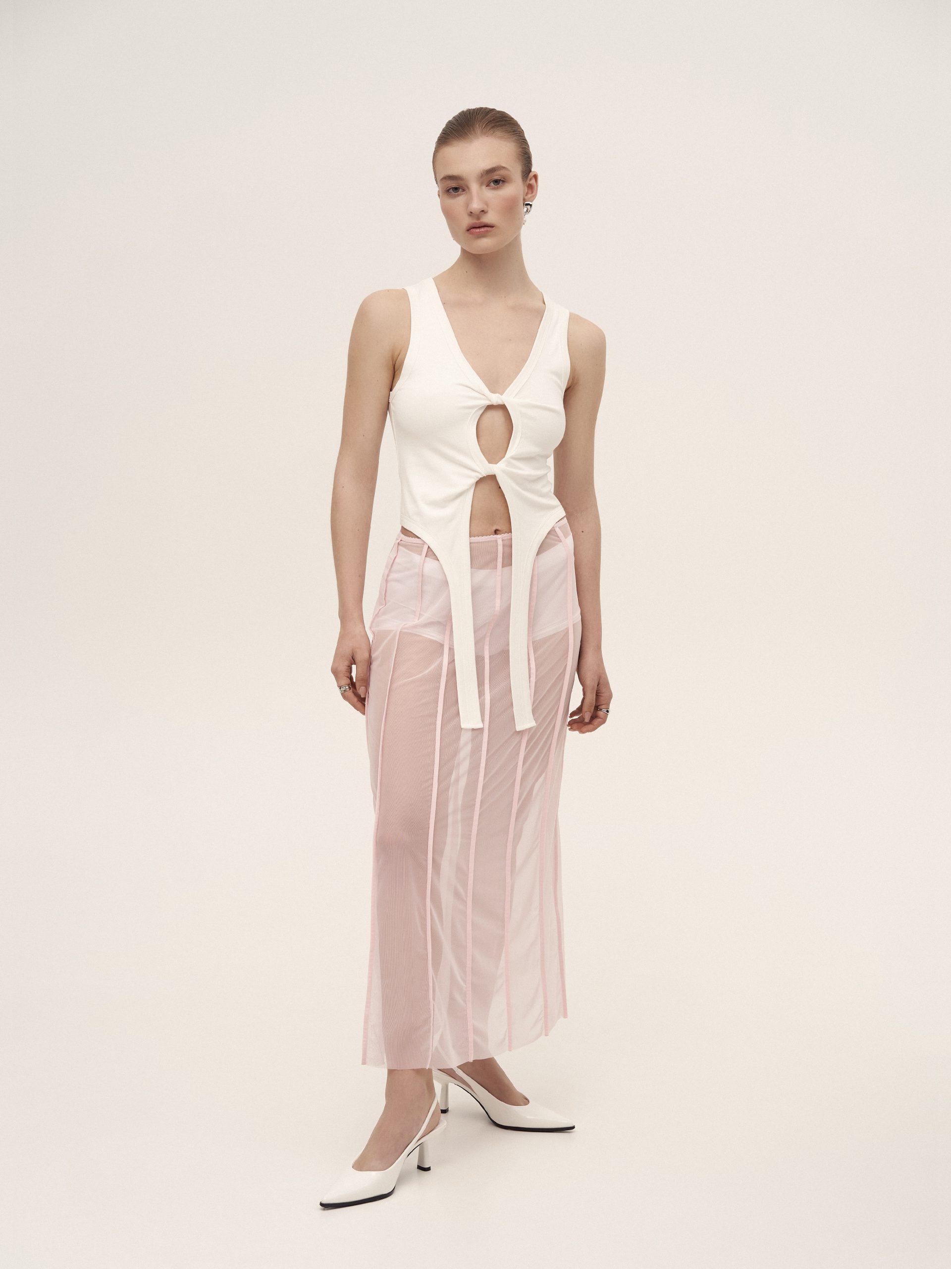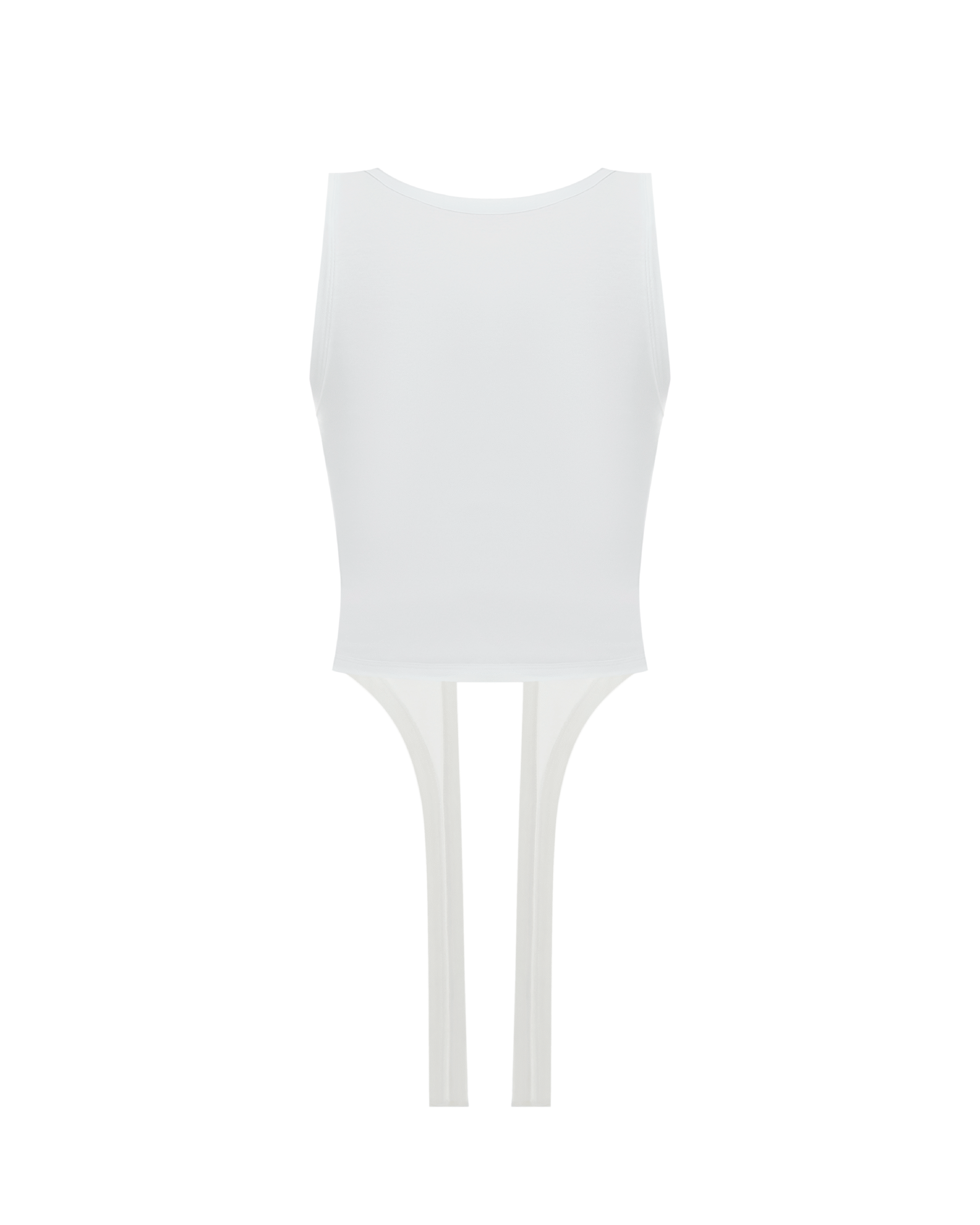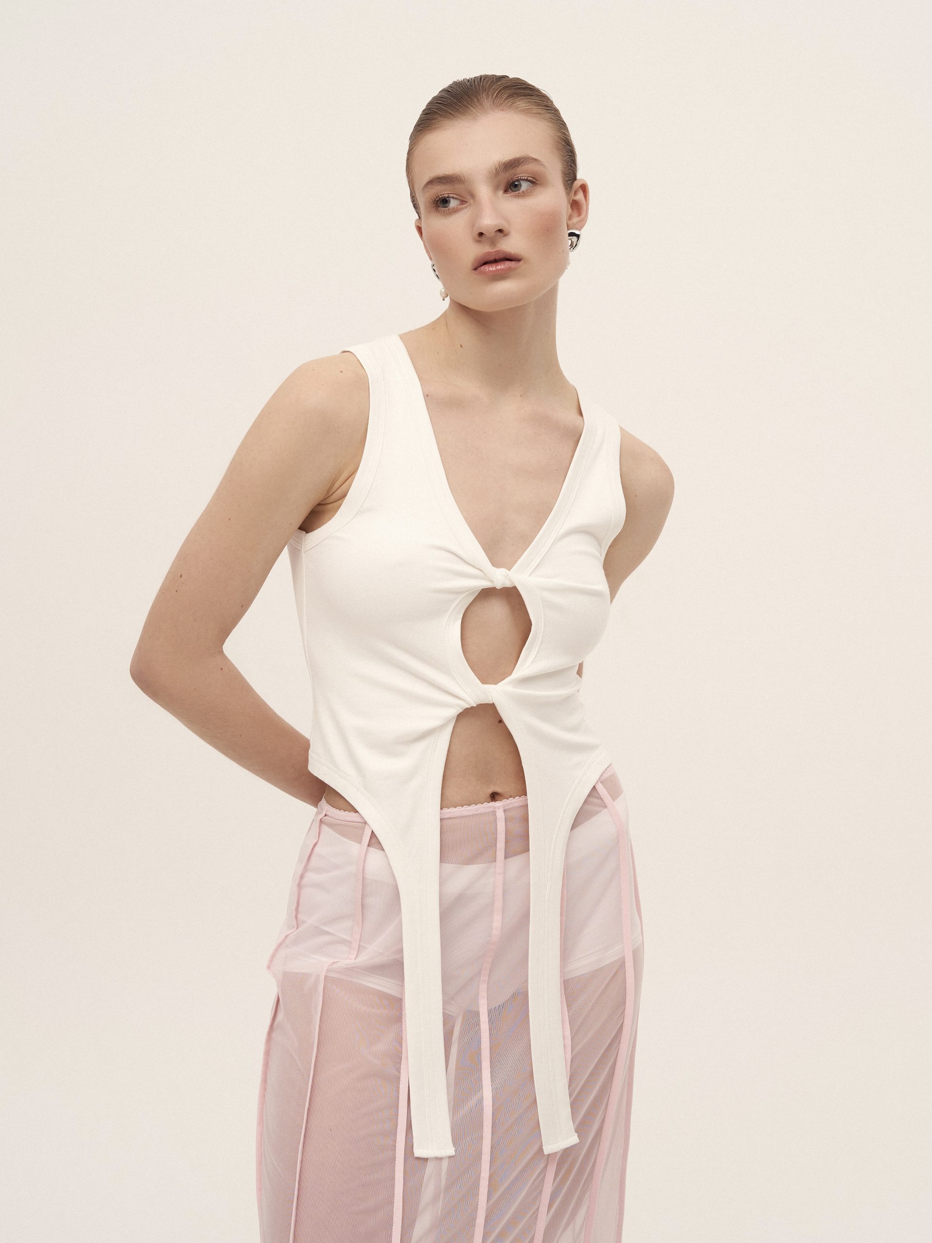 Майка з перекрутами, виготовлена з мʼякого трикотажу. Виріб має декоративні гартери. Передня частина майки подвійна, що робить її комфортною та непрозорою на тілі. Довжина до лінії стегон.