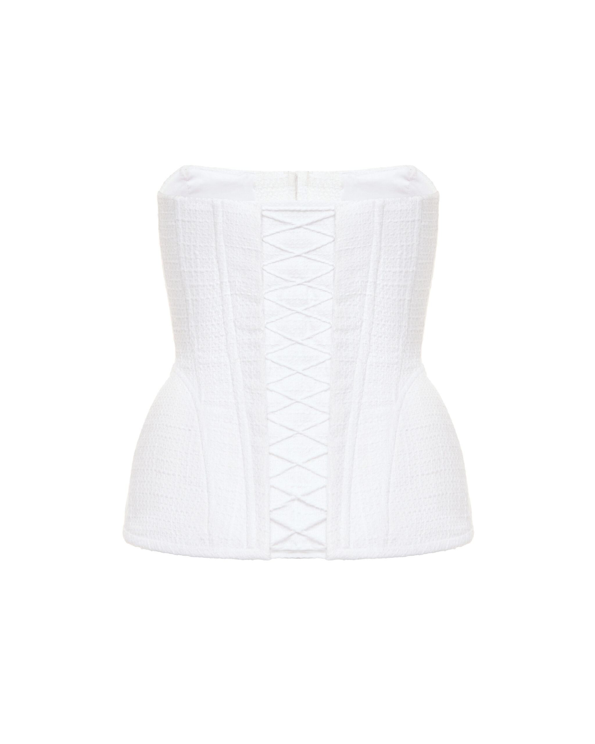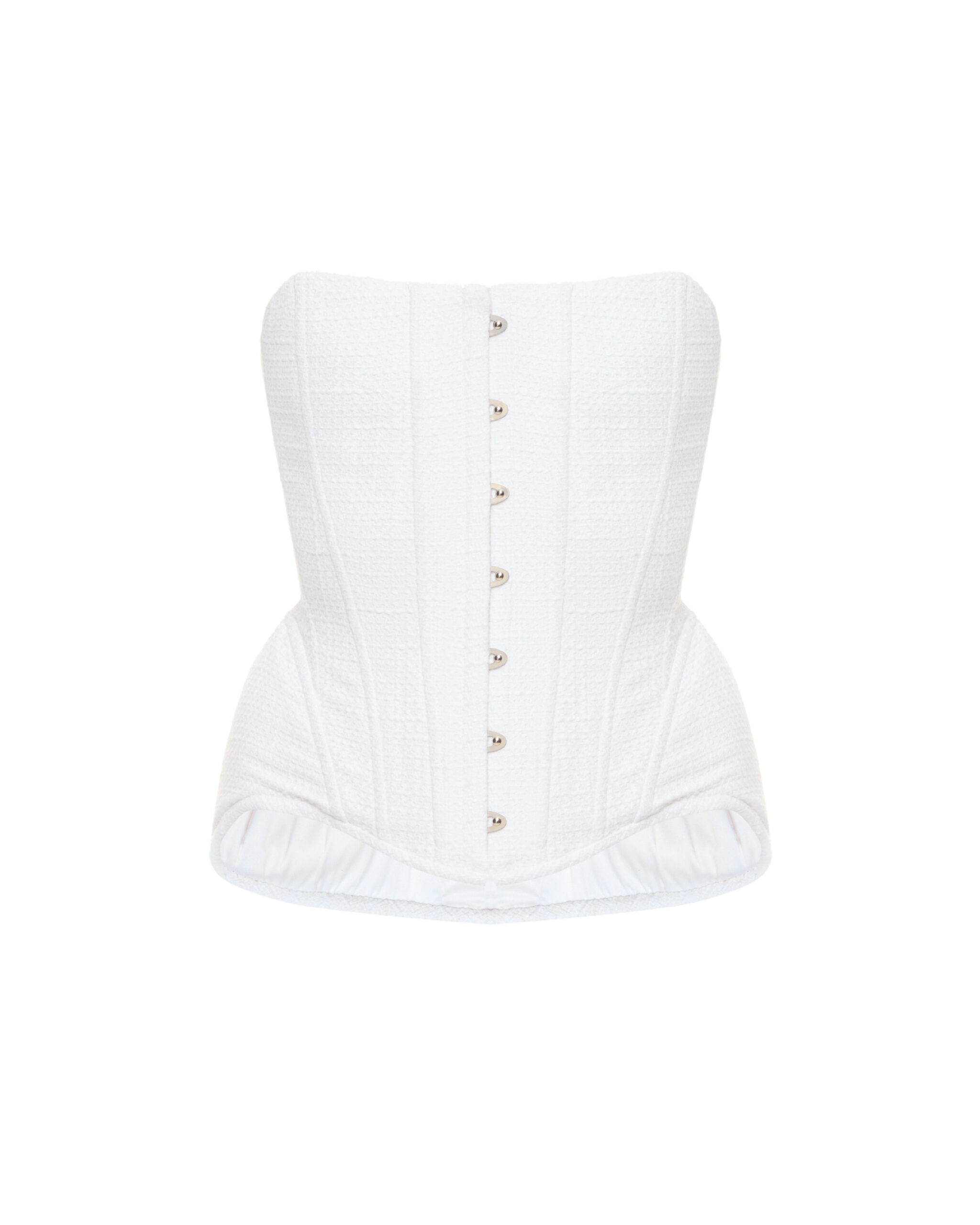 Корсет скульптурного силуету, виготовлений із фактурної бавовни на підкладці. Виріб має спеціальні накладки на стегнах, які витончено моделюють жіночний силует— звужуючи талію та підкреслюючи стегна. Спереду застібається на корсетний бюск, на спинці— шнурівка для регулювання об’єму. Довжина корсета вище лінії стегон.