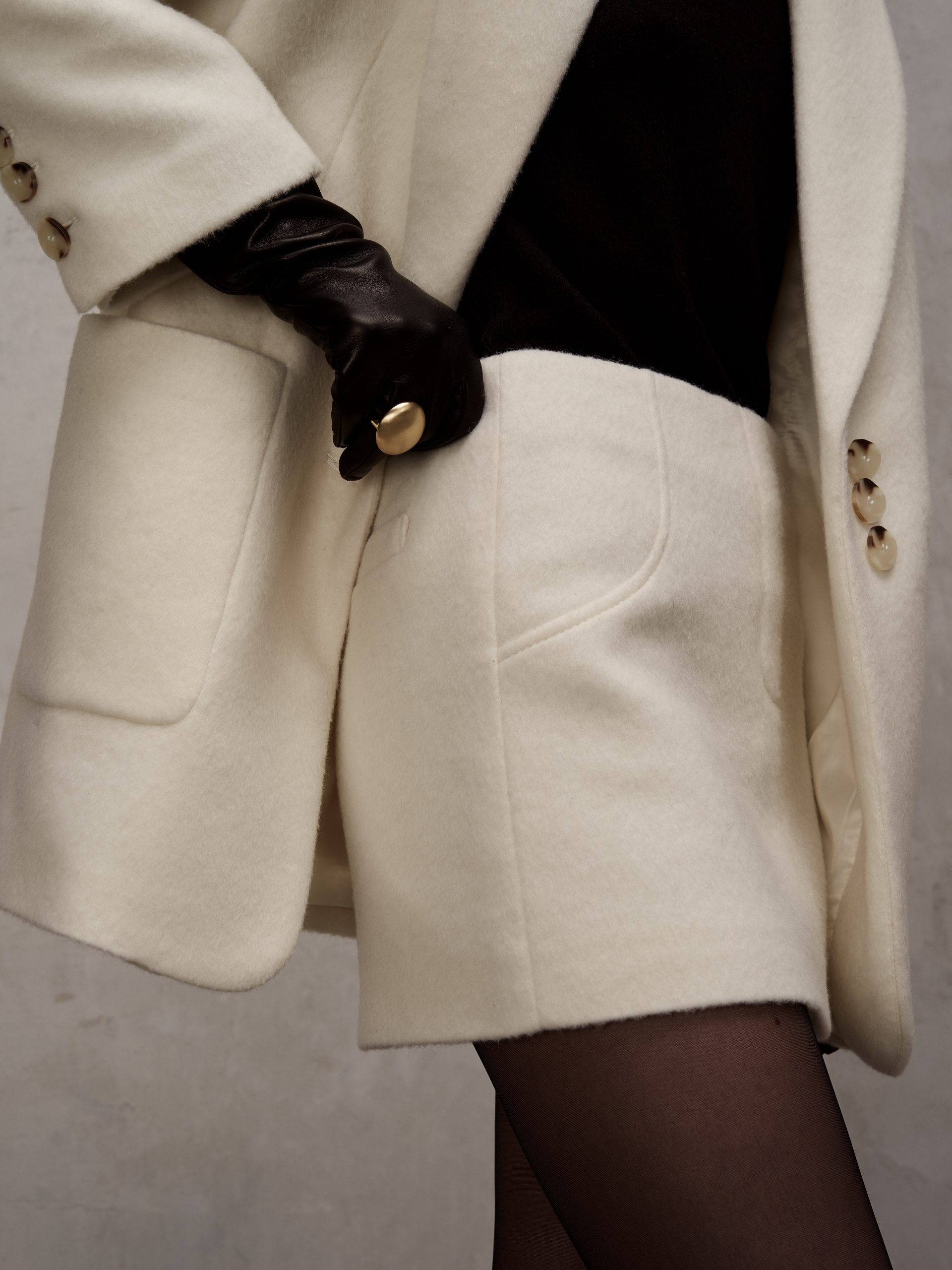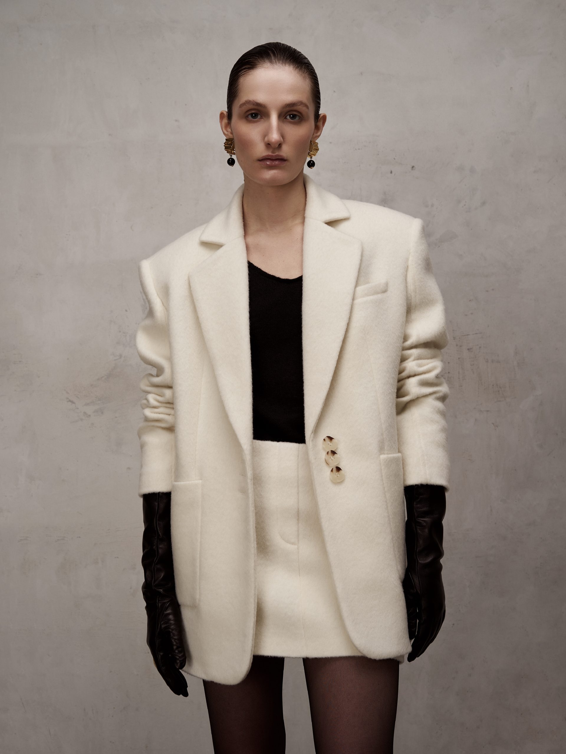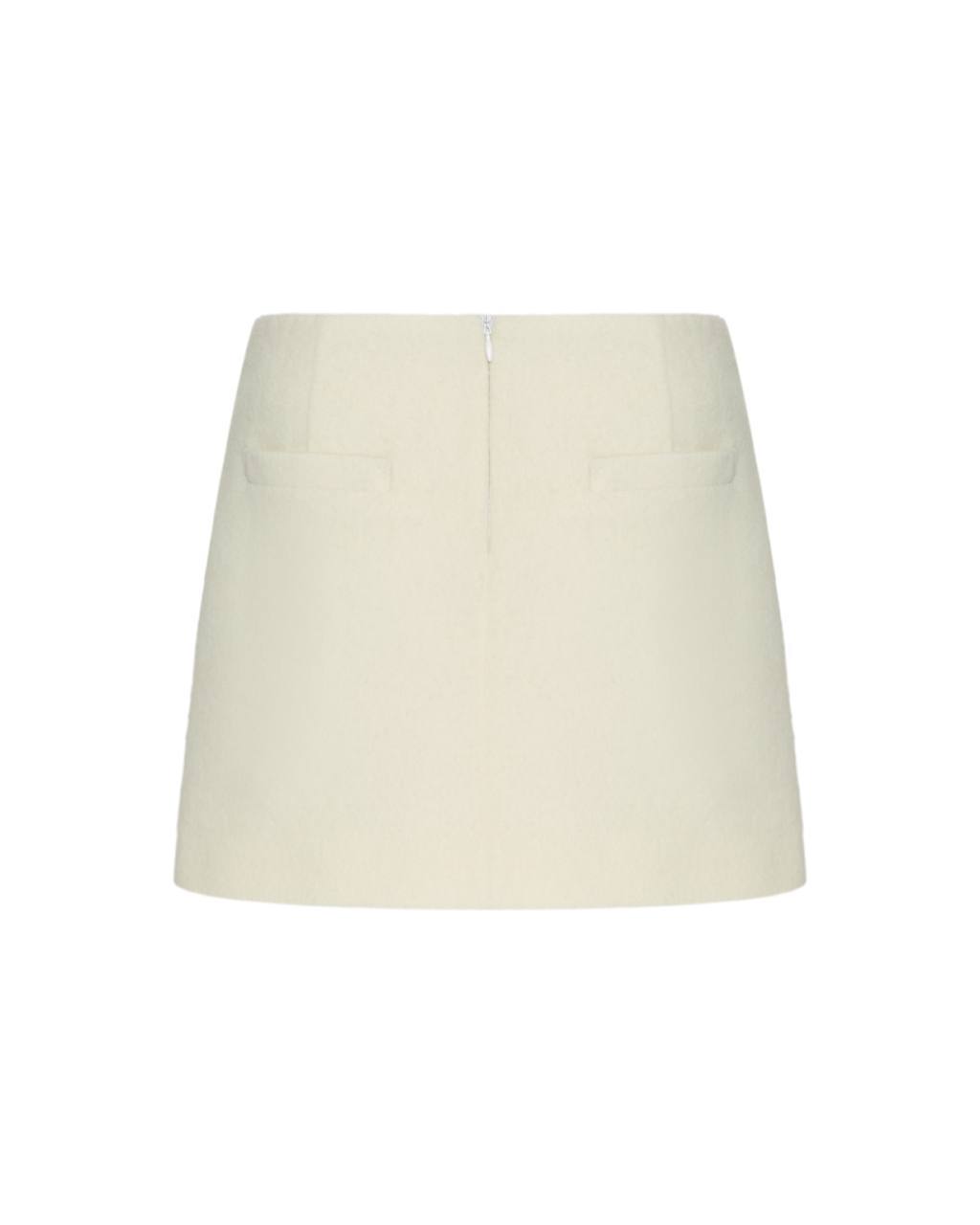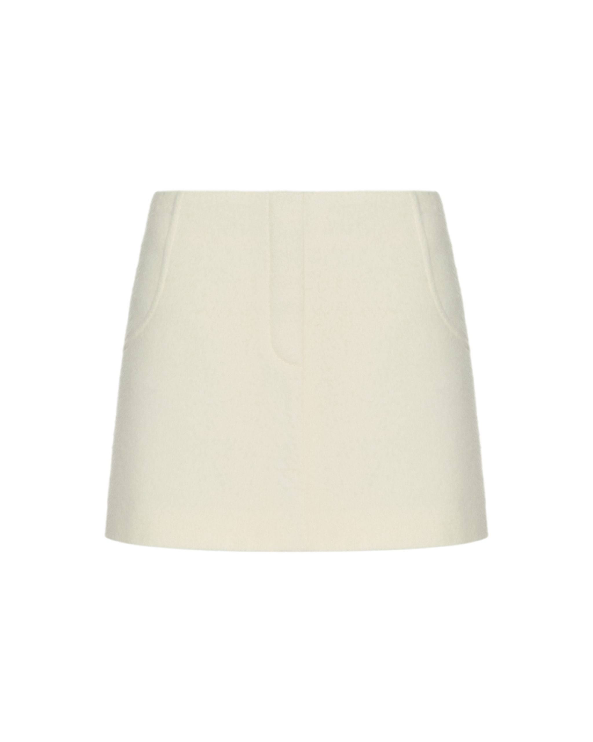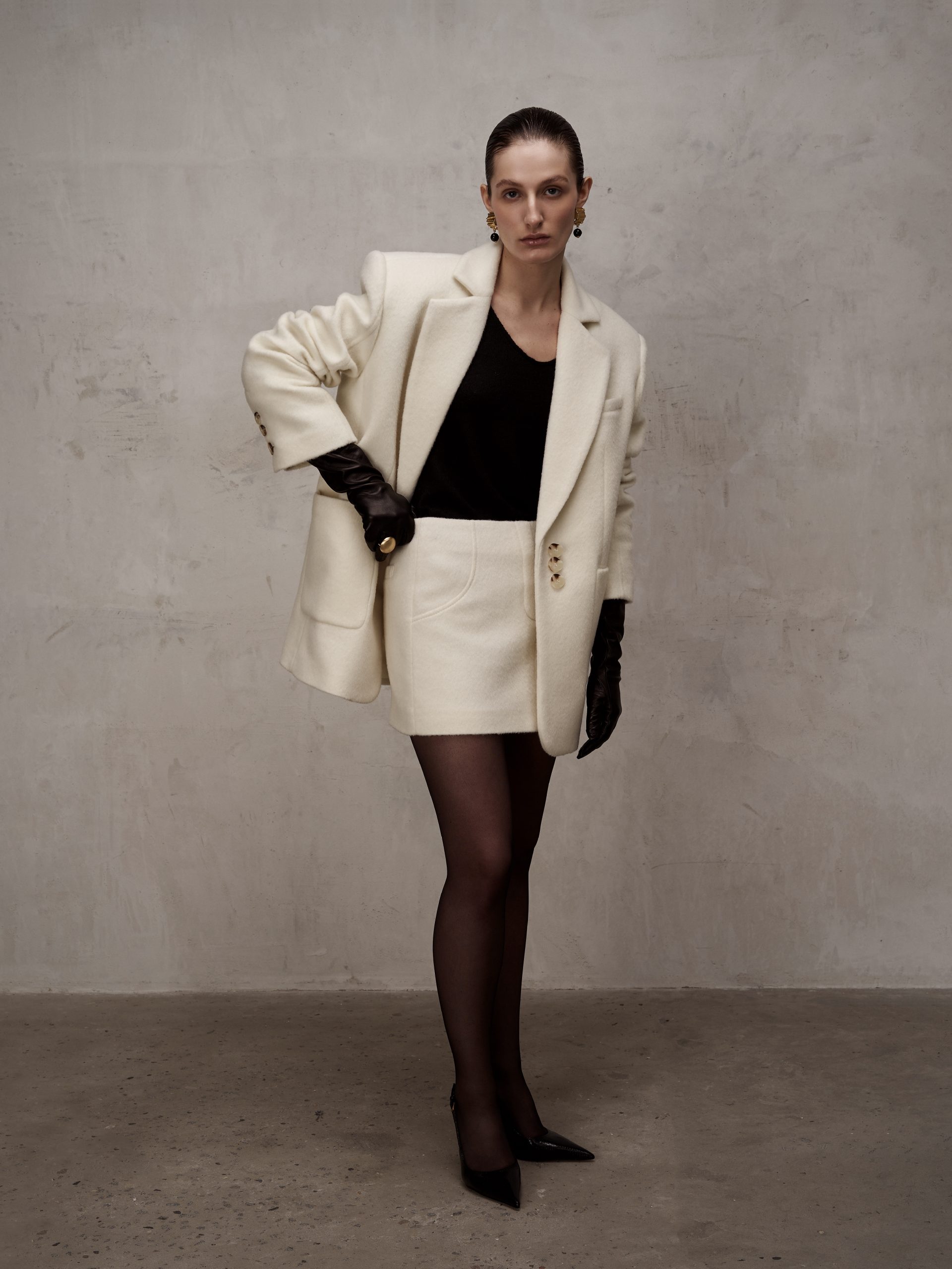 Спідниця трапецевидного крою, виготовлена з пальтового мʼякого кашеміру на підкладці. Виріб має нефункціональний гульфік та кишені з декоративним відстроченням. Застібається на потаємну блискавку в середньому шві. Довжина спідниці міні.