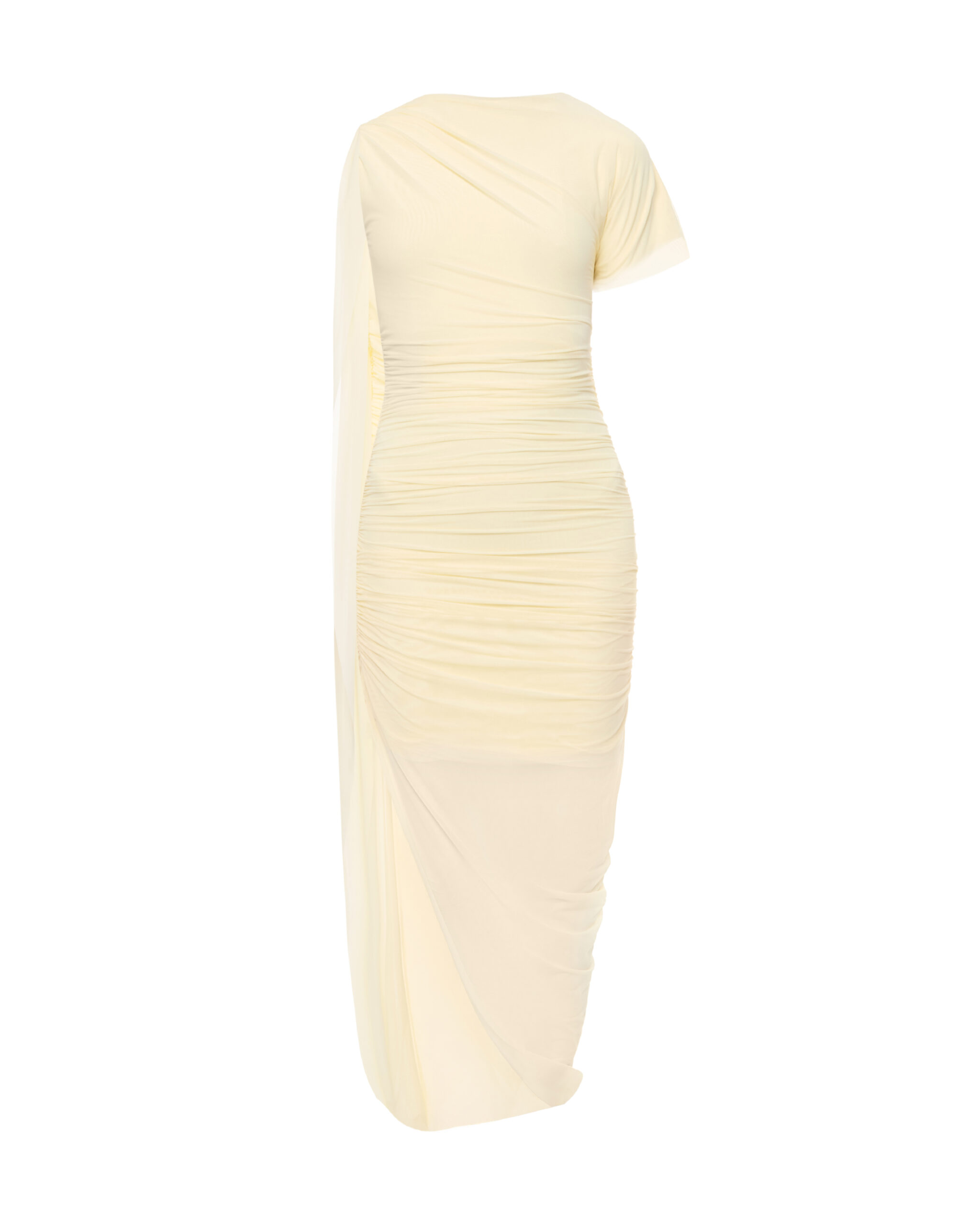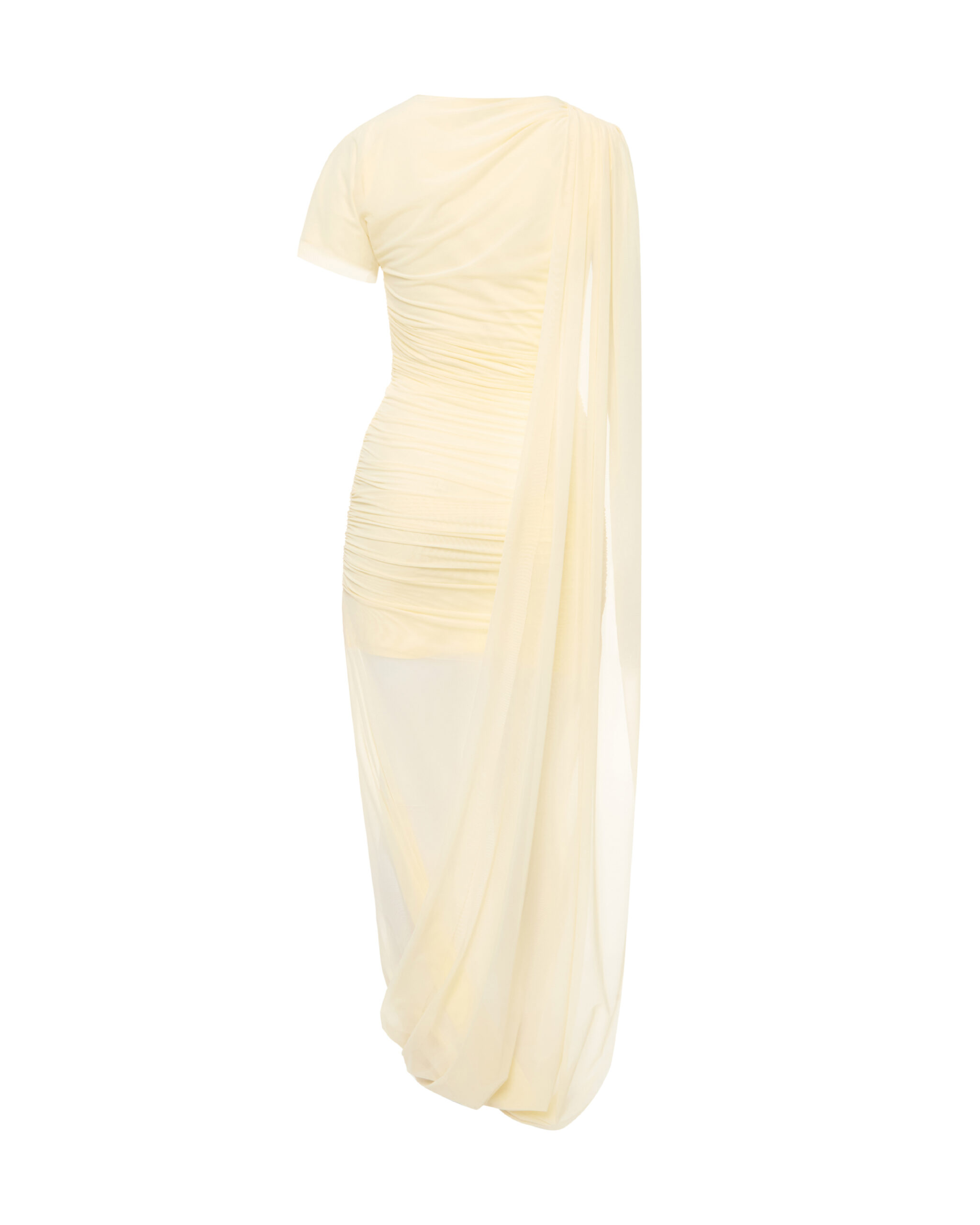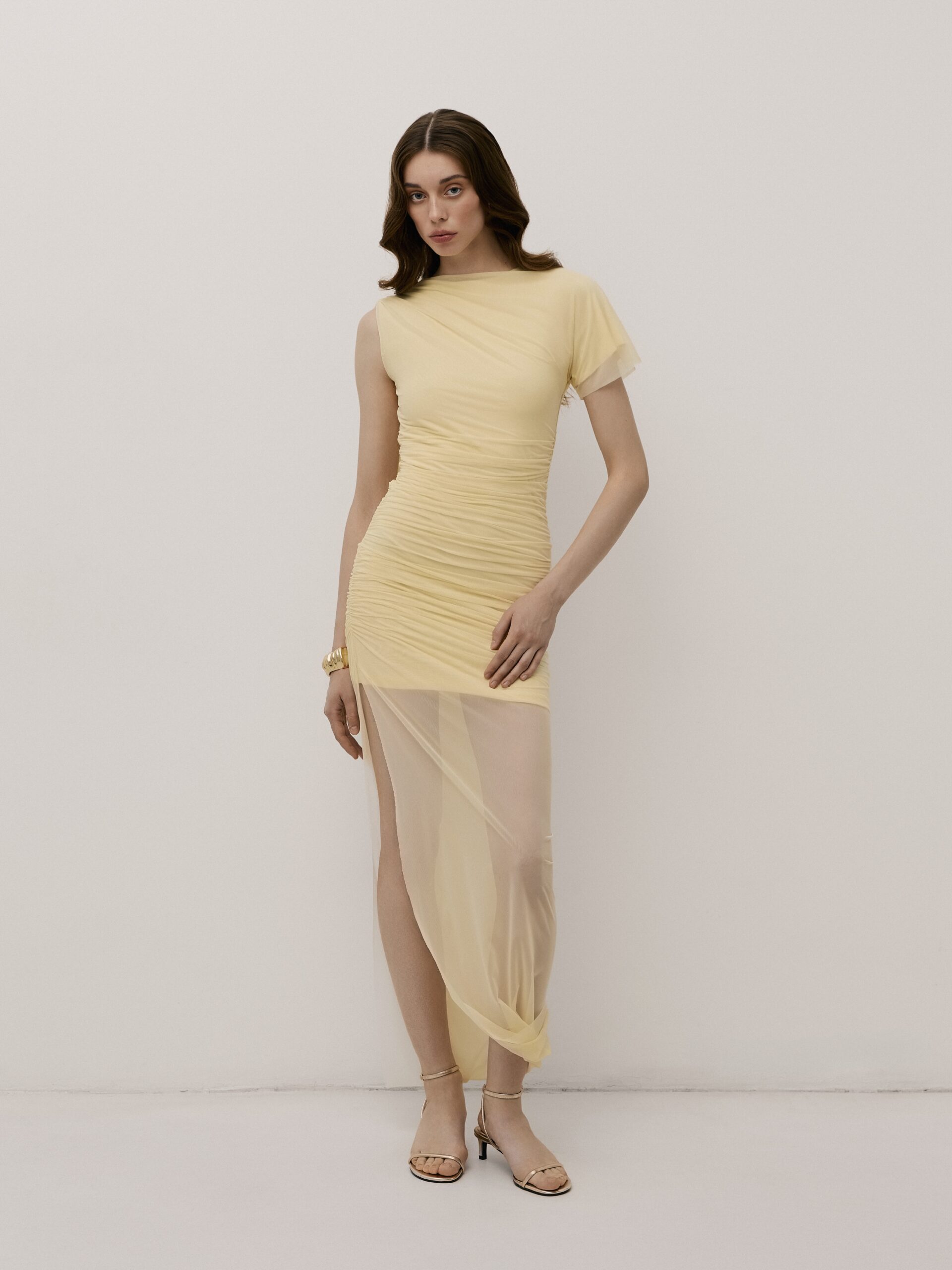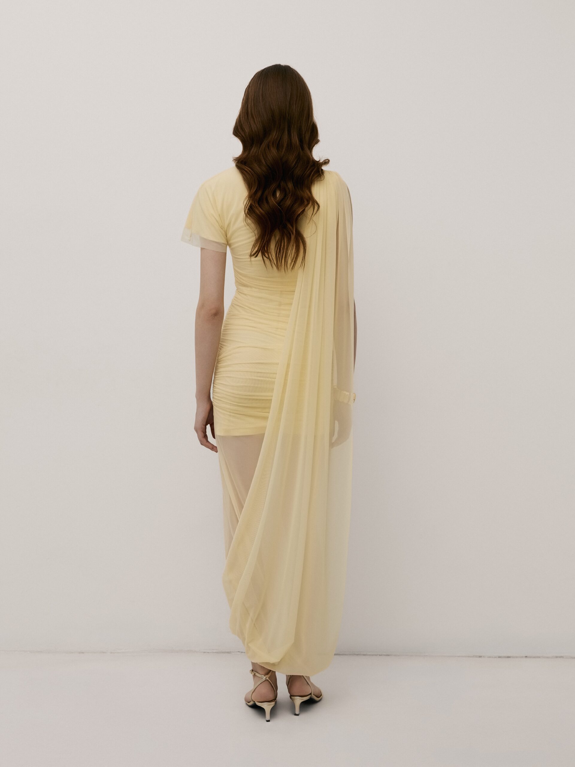 Сукня асиметричного крою, виготовлена з м’якої сітки на підкладці. Виріб має високий розріз, м’яке драпірування та подовжену спідницю, що переходить у шлейф, який закінчується в плечовому шві на спинці. Довжина сукні максі.