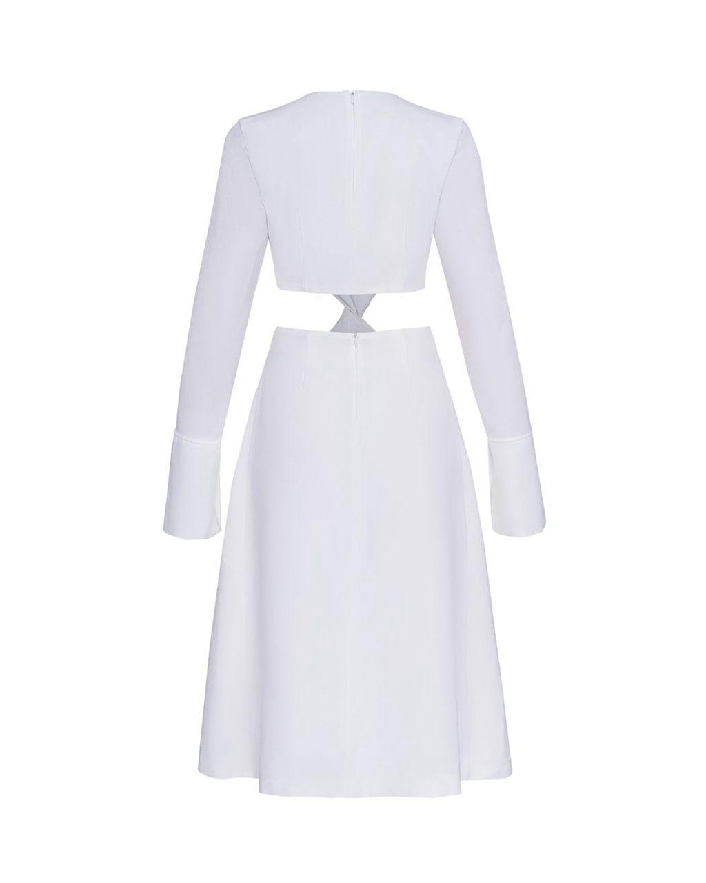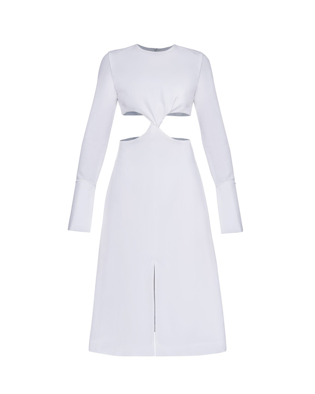 Сукня з перекрутом, на спідниці розріз вище лінії коліна, застібки дві – на спинці топа і центральна застібка на спідниці ззаду, довжина нижче колін