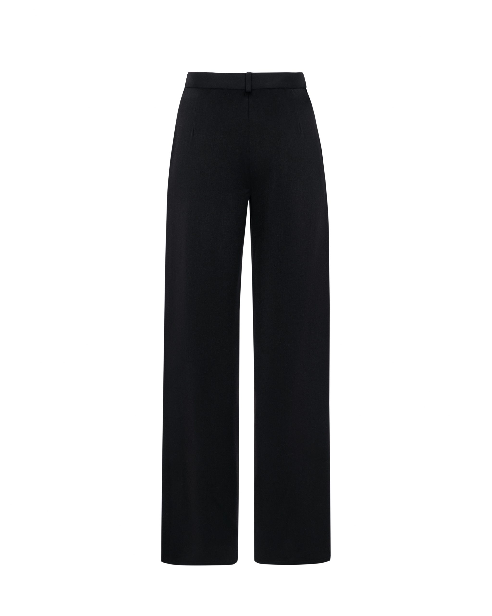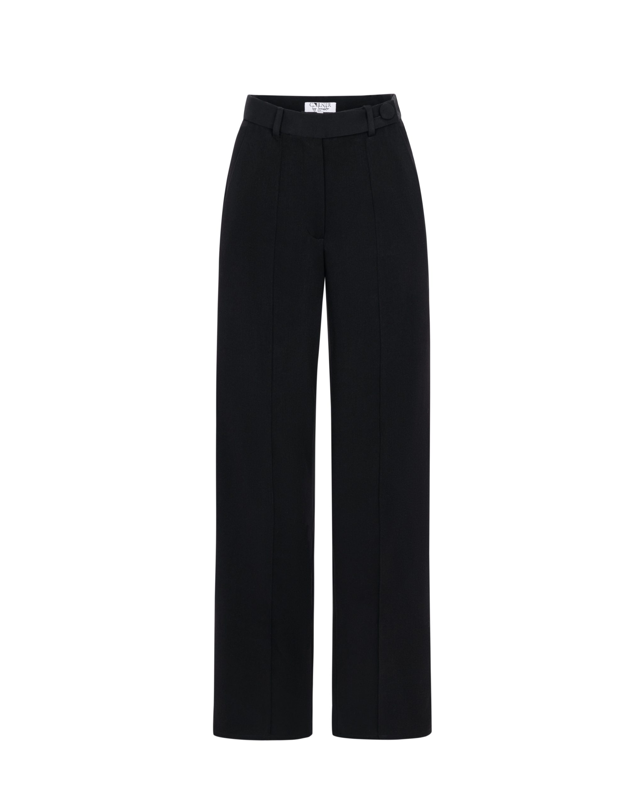 Штани помірного об’єму, прямого силуету за чоловічим типом, із застроченими стрілками. На задніх половинках талієві виточки. На передніх половинках штанів функціональні кишені із відрізним бочком. Пояс відрізний з уступом, на поясі – шльовки. Верхній край пояса розташований нижче за природню лінію талії. Довжина штанів у підлогу з складкою, що закладається.